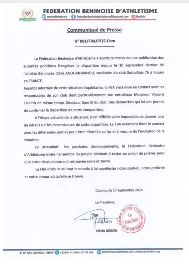 Viérin Dégon, président de la Fédération Béninoise d’Athlétisme, a réagi à la disparition d’Odile Ahouanwanou. Selon Fraternité FM, il a entrepris des démarches pour se renseigner sur la situation depuis le Bénin.