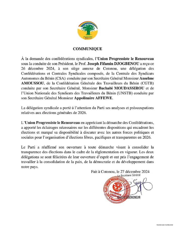 Le jeudi 26 décembre 2024, le parti Union Progressiste le Renouveau a rencontré les confédérations et centrales syndicales. Cette rencontre s’est tenue au siège annexe du parti à Cotonou.