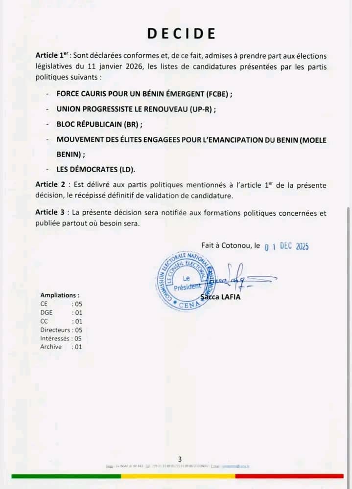 La CENA a confirmé, ce lundi 01 décembre 2025, que les dossiers de candidature des partis suivants ont été acceptés: FCBE, UP‑R, BR, MOELE BENIN et LD. Tous les documents requis ont été jugés conformes, ce qui permet à ces formations de participer aux élections législatives prévues le 11 janvier prochain.