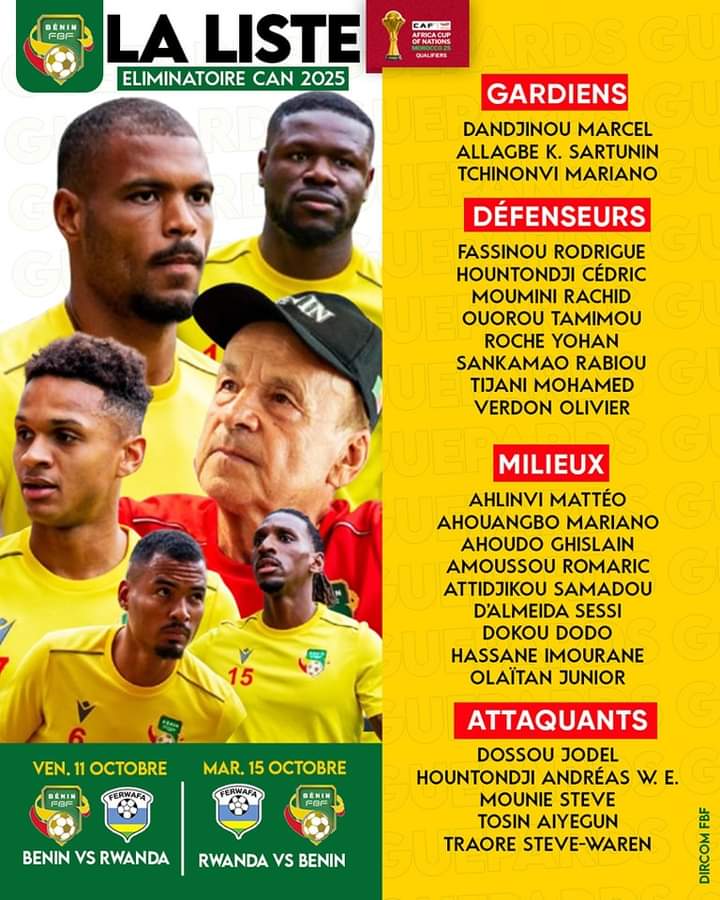Éliminatoires CAN 2025 : voici la liste des 25 Guépards sélectionnés pour la 3e et 4e journée Sport 05/10/202405/10/2024 Martin HOUNKPELeave a Comment on Éliminatoires CAN 2025 : voici la liste des 25 Guépards sélectionnés pour la 3e et 4e journée 916Ce samedi 5 octobre 2024, le sélectionneur Gernot Rohr a dévoilé la liste des 25 Guépards retenus pour la double confrontation contre le Rwanda. Découvrez ici la liste complète ci-dessous. Léandre HOUAN