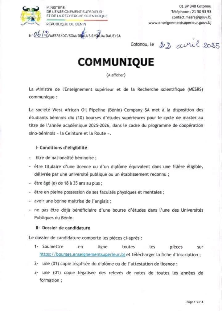 Dix étudiants auront la chance de se partager équitablement dix bourses offertes par la société West African Oil Pipeline (Bénin) Company SA. Ce programme, annoncé par la Ministre de l’Enseignement supérieur et de la Recherche scientifique (MESRS) via un communiqué en date du 22 avril 2025, s’inscrit dans le cadre de la coopération sino-béninoise «Ceinture et Route de la soie» pour l’année académique 2025-2026. Destinées au cycle Master, ces bourses visent à encourager l’excellence académique et à renforcer les liens entre le Bénin et la Chine.