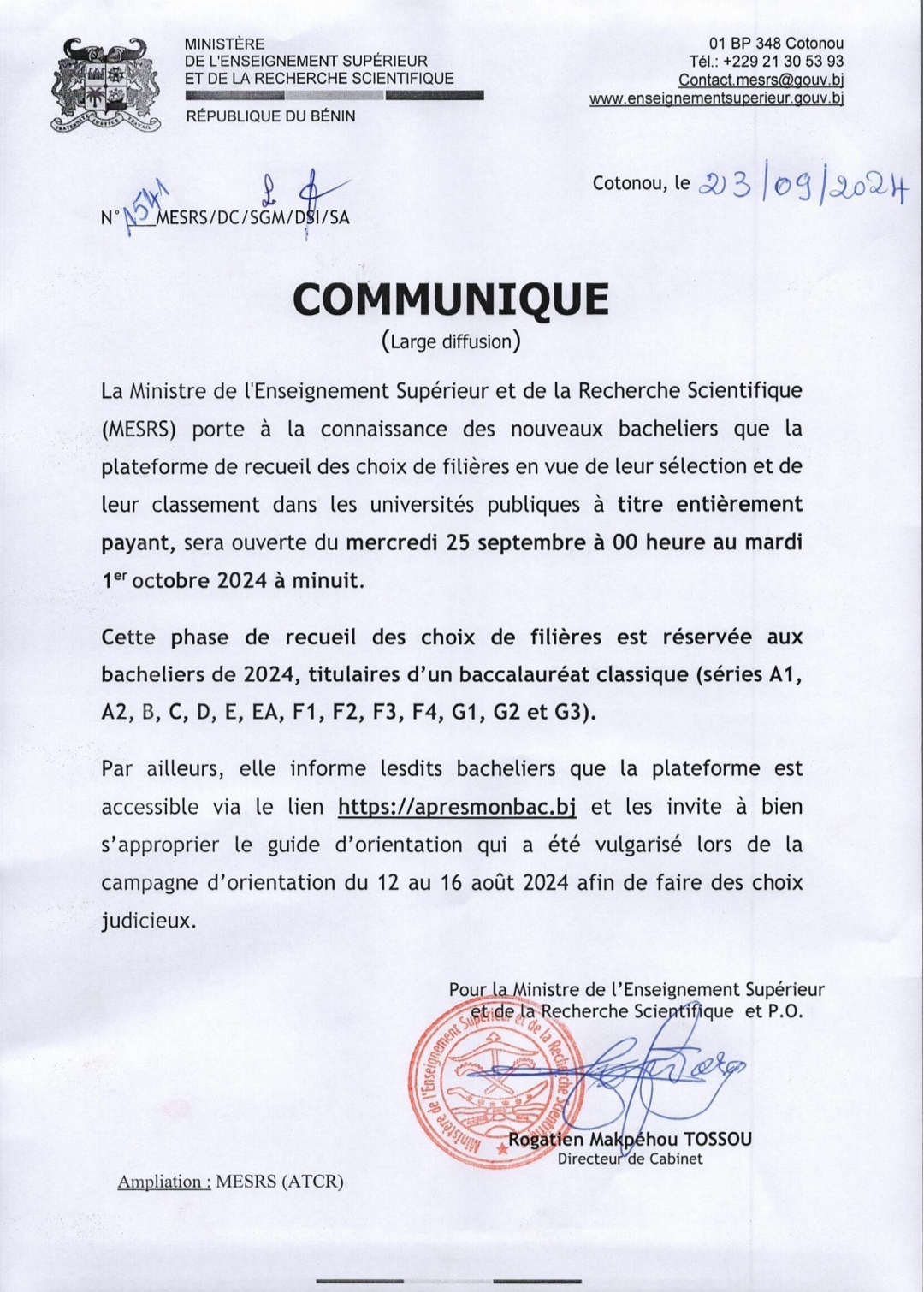 Par un communiqué un communiqué en date de ce 23 septembre 2024, le Ministre de l’Enseignement Supérieur et de la Recherche Scientifique, Eléonore Yayi Ladekan informe les nouveaux bacheliers que la plateforme de recueil des choix de filières en vue de leur sélection et de leur classement dans les universités publiques à titre entièrement payant, sera ouverte du mercredi 25 septembre à 00 heure au mardi 1er octobre 2024 à minuit. Lire le communiqué ci-dessous👇