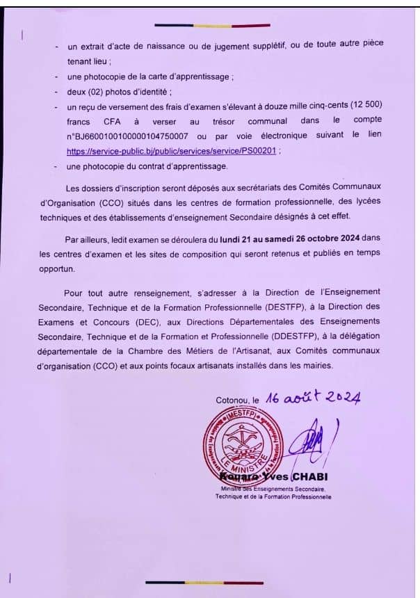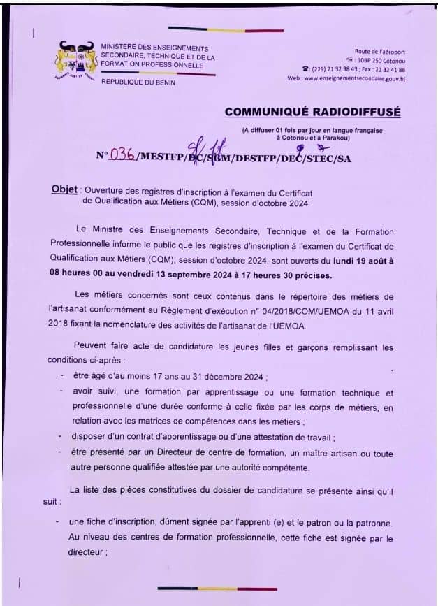 Les registres d’inscription à l’examen du certificat de qualification aux métiers (CQM), session d’octobre 2024 sont ouverts du lundi 19 août au vendredi 13 septembre 2024. Voir ci-dessous les conditions et les pièces à fournir dans le communiqué signé par le ministre des enseignements secondaire, technique et de la formation professionnelle.
