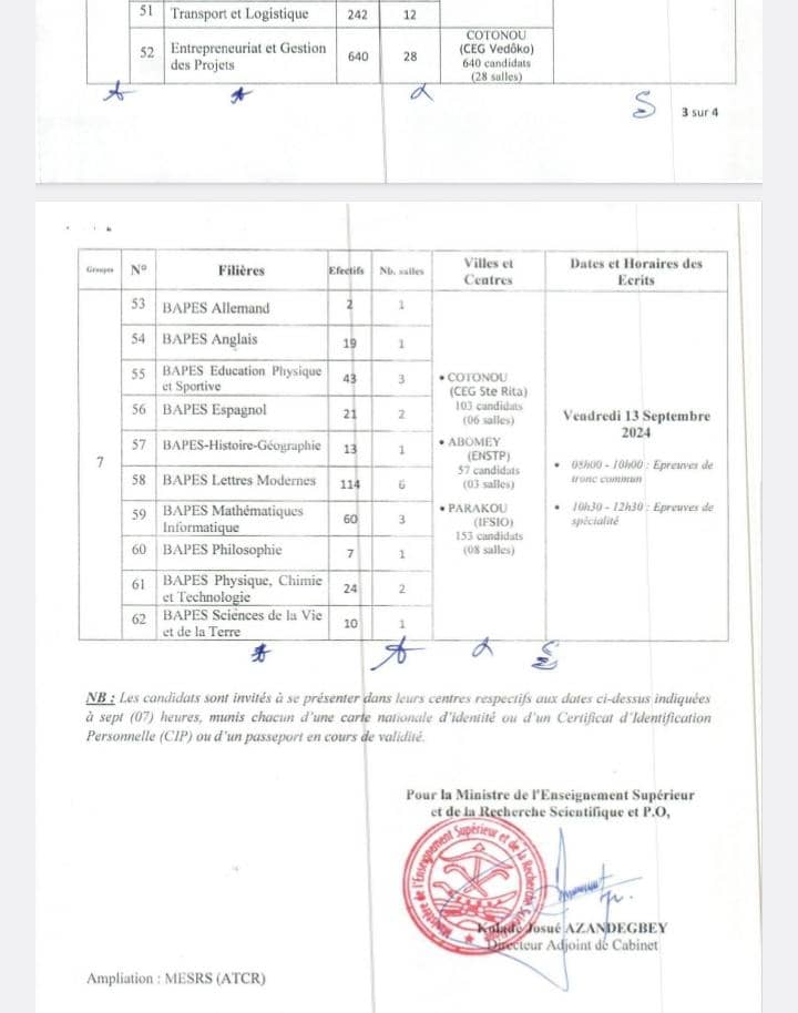 L’annonce a été faite par une note de service du directeur adjoint de cabinet de Madame Eléonore Yayi Ladekan, ministre de l’enseignement supérieur et de la recherche scientifique. Selon la note adressée aux candidats, les compositions vont durer environ un mois et prendront fin le 13 Septembre.