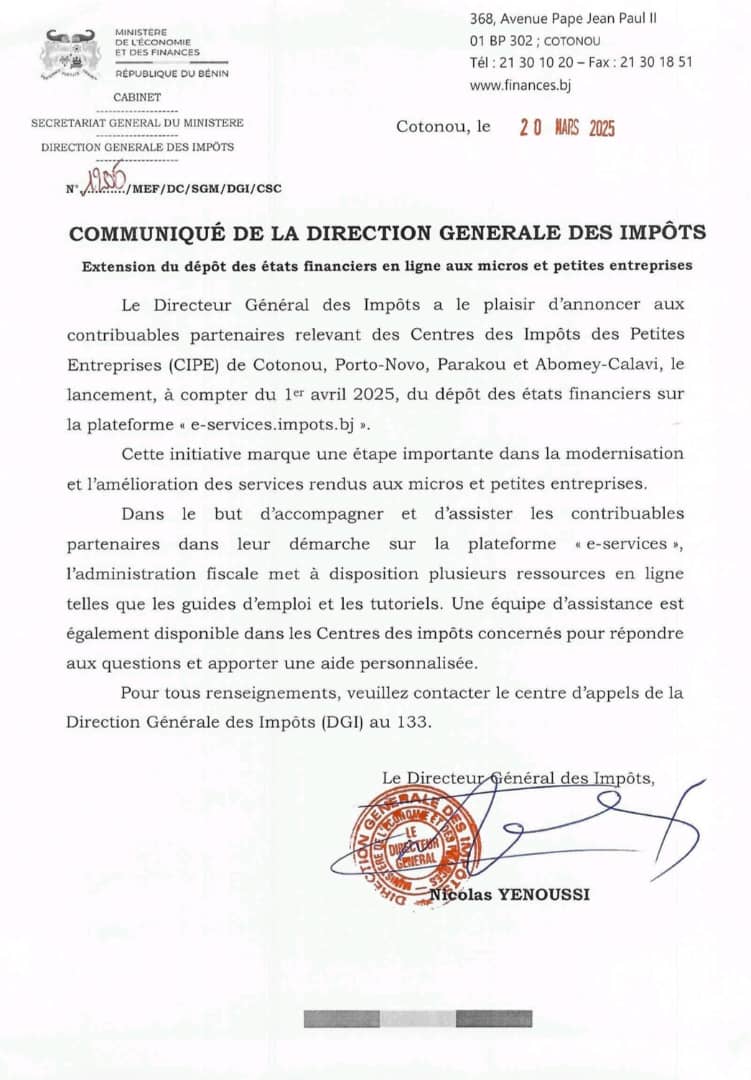 D’ici le 1er avril, les micros et petites entreprises relevant des Centres des impôts des petites entreprises (CIPE) de Cotonou, Porto-Novo, Parakou et Abomey-Calavi, pourront effectuer le dépôt de leurs états financiers sur la plateforme « e-services.impots.bj ». C’est dans un communiqué que le directeur général des impôts porte l’information à la connaissance du public. Cette initiative s’inscrit dans me cadre de la modernisation et l’amélioration des services rendus aux micros et petites entreprises. L’autorité rassure toutes les personnes concernées que des dispositions sont prises pour les assister dans la mise en application de cette décision.Lire le communiqué ci-dessous.Suivez plus d’actualité en vous abonnant gratuitement à notre chaîne WhatsApp👇https://whatsapp.com/channel/0029VaDRmSrJJhzhSaGmWF2c