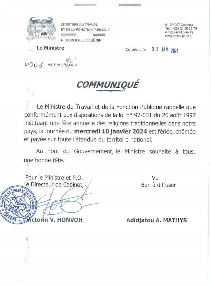 Dans un communiqué du Ministère de travail et de la fonction publique, la journée du mercredi 10 janvier 2024 est déclarée fériée, chômée et payée dans le cadre des festivités 2024 des religions endogènes République du Bénin. Le communiqué ci-dessous.