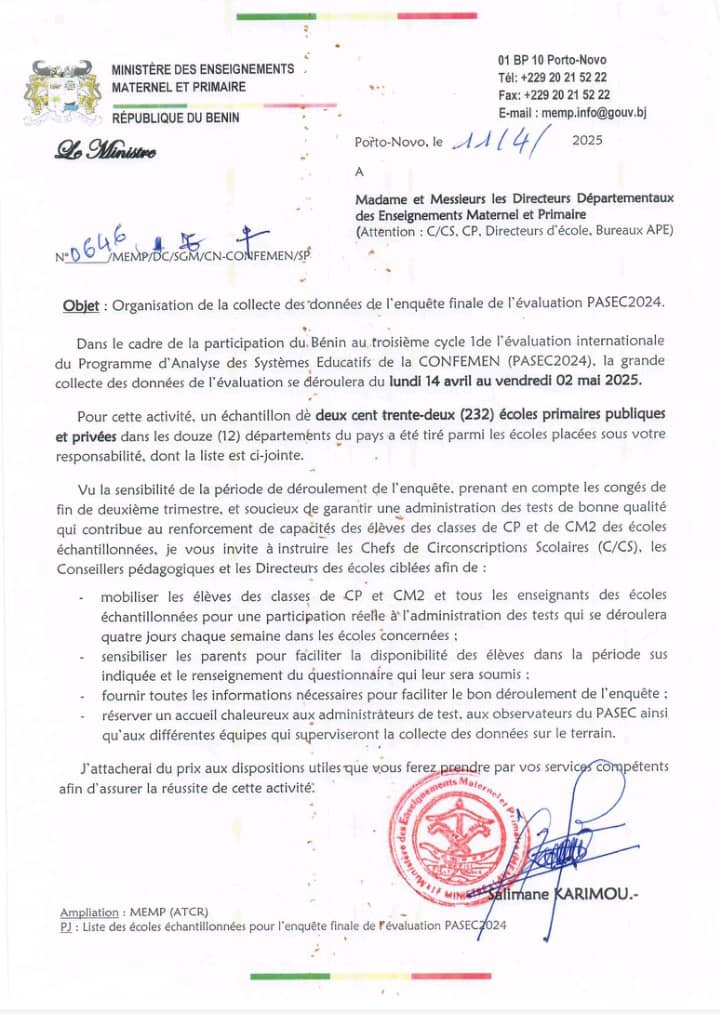 Les élèves et enseignants des classes de CP et CM2 de plusieurs écoles primaires publiques et privées du Bénin, passeront les congés de fin du 1er trimestre dans les salles de classes. Cette décision intervient dans le cadre de la grande collecte de données de l’enquête finale de l’évaluation internationale du Programme d’Analyse des Systèmes Educatifs de la Confemen (PASEC2024), qui se déroulera du 14 avril au 2 mai 2025.