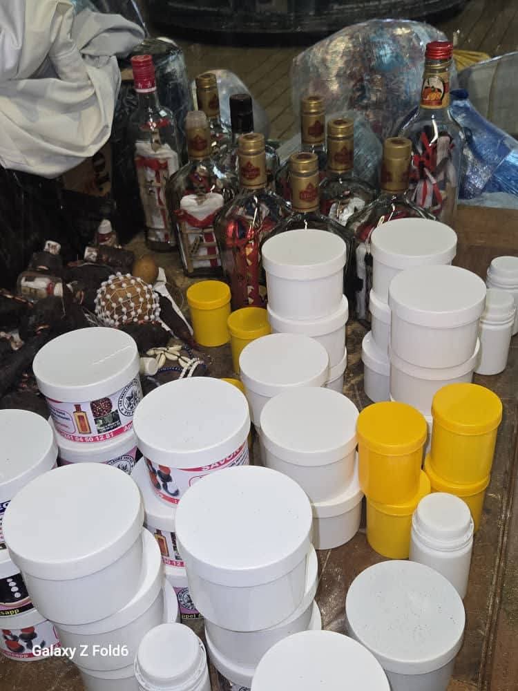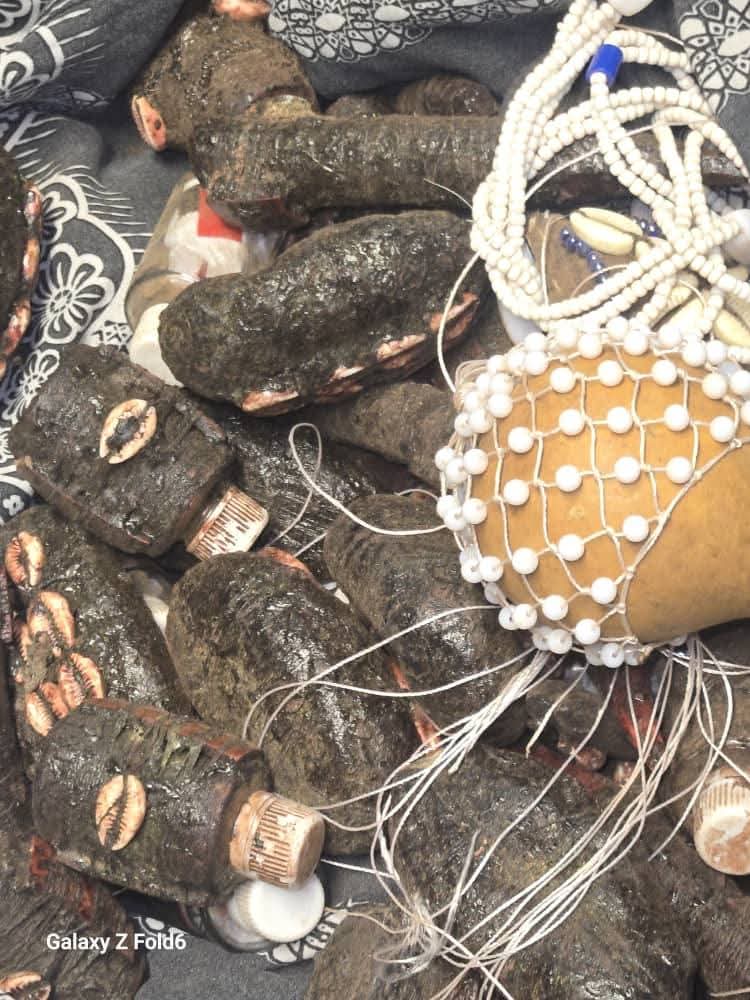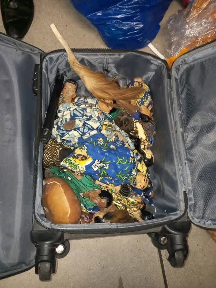 Dans une deuxième publication de la Douane, on voit des photos d’objets considérés comme des fétiches contenus dans des valises appartenant au sieur HOUNYE HOUNGBONON Dominique. Il était à bord du vol Camair Co en provenance de Cotonou le samedi 20 septembre 2025. L’interpellation a eu lieu vers 02 heures du matin.