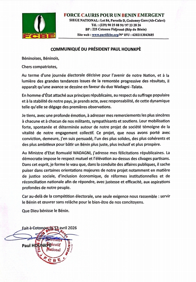 Le candidat de la Force Cauris pour un Bénin Émergent ( FCBE), Paul HOUNKPE, a réagi au lendemain du scrutin présidentiel du 12 avril 2026. Après avoir pris connaissance et analysé les grandes tendances des résultats de l’élection présidentielle, l’homme de Bopa a reconnu le camp d’en face favori. En laissant de côté les « clivages partisans», le Secrétaire Exécutif de la FCBE a adressé ses « félicitations républicaines» à Romuald Wadagni. Lire la déclaration ci-dessous.