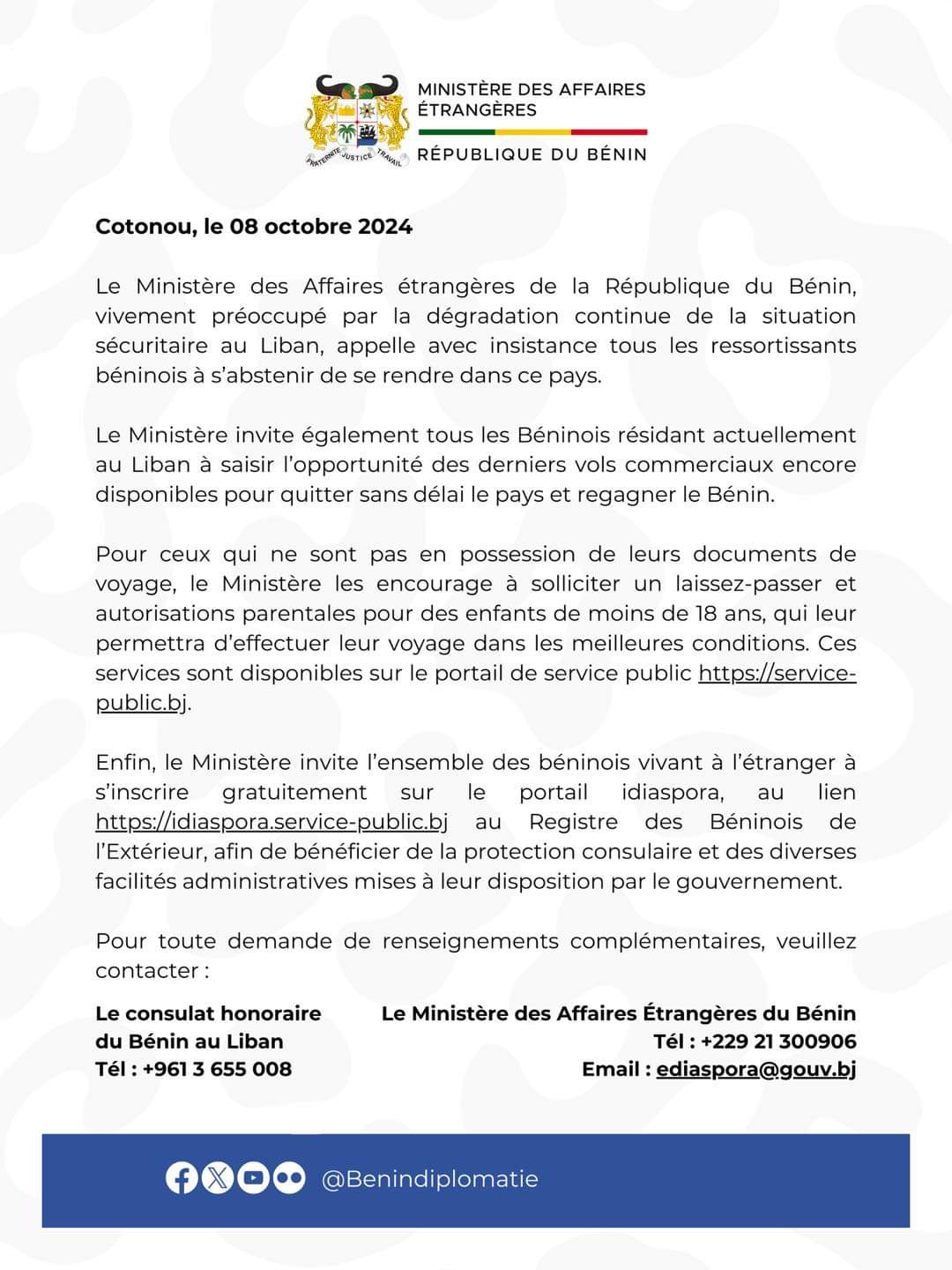 Préoccupé par cette situation, le gouvernement béninois a, par un communiqué en date de ce 08 octobre 2024, invité les Béninois vivant au Liban à se rendre dans leur pays contre toute attente. Il est aussi demandé à tout citoyen béninois de s’abstenir de se rendre dans ce pays du Proche-Orient en ce temps d’horreur.