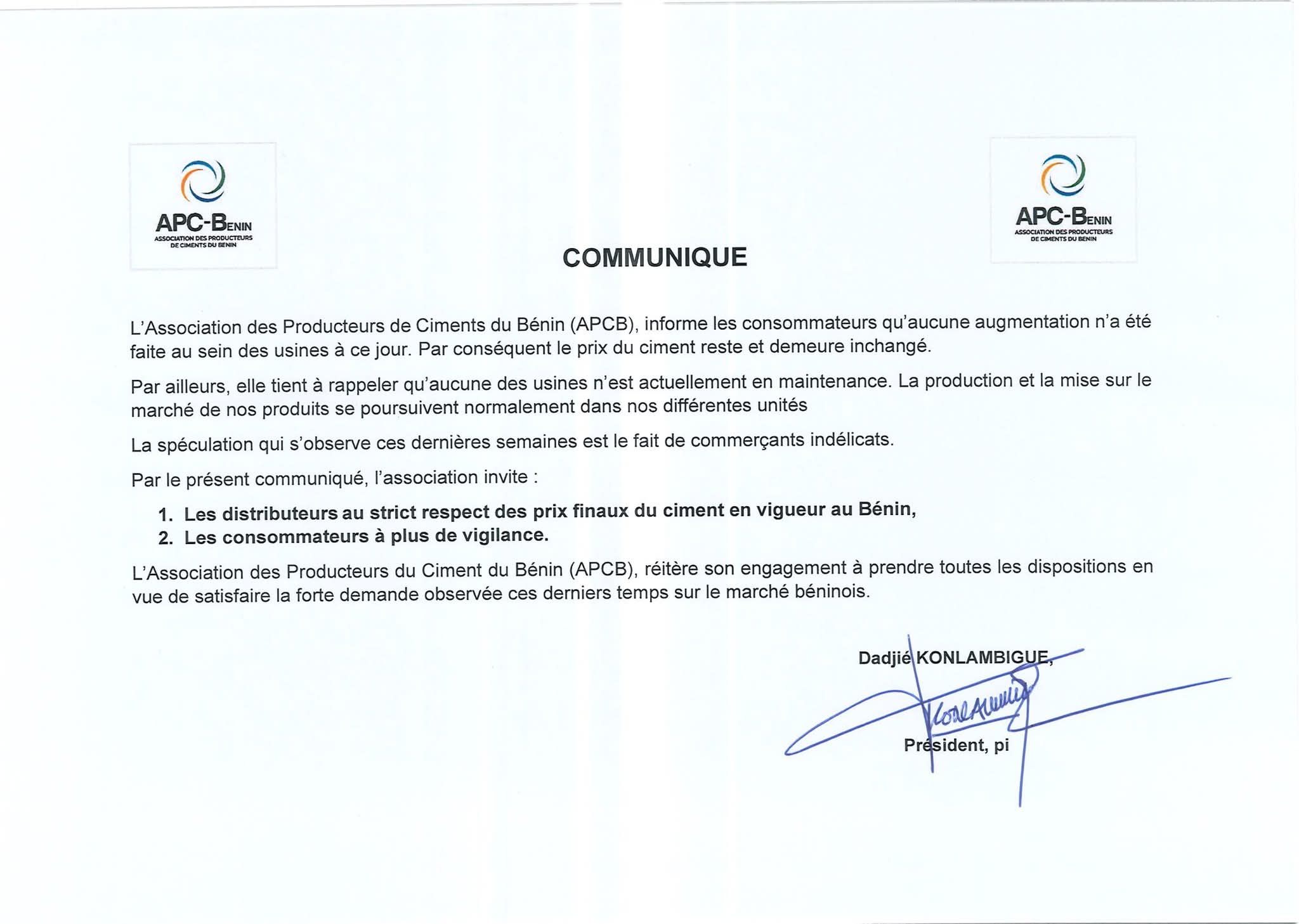 Depuis un certain temps, le prix du ciment a pris son envol. Face à cette montée qui suscite des inquiétudes, l’Association des Producteurs de Ciments du Bénin (APCB) a réagi à travers un communiqué officiel pour clarifier la situation.