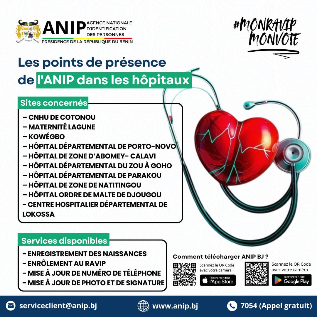 L’Agence nationale d’identification des personnes (ANIP) a mis en place des postes dans plusieurs centres de santé à travers tout le Bénin pour offrir des services administratifs directement aux usagers. Cette initiative vise à faciliter l’accès des populations aux services d’identification, partout et à tout moment. Les citoyens peuvent désormais effectuer plusieurs démarches lors de leur passage à l’hôpital. Les services proposés sont: l’enregistrement des naissances, l’enrôlement au Registre national des personnes physiques (RAVIP), la mise à jour du numéro de téléphone, de la photo et de la signature.