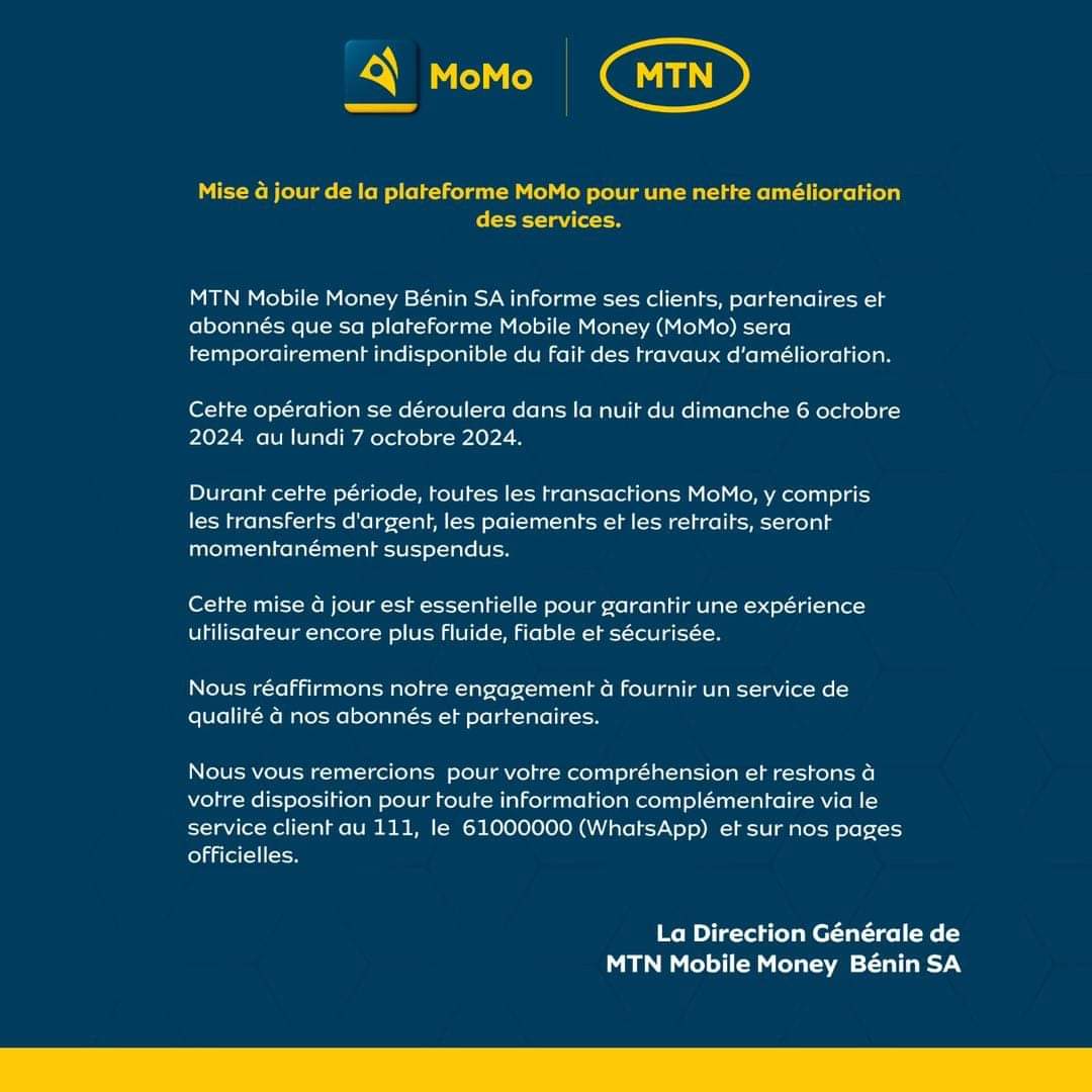 Par un communiqué, MTN Mobile Money Bénin SA a informé l’ensemble de ses clients depuis quelques jours que, du fait des travaux d’amélioration, la plateforme MoMo sera indisponible dans la nuit du dimanche 6 octobre au lundi 7 octobre 2024.