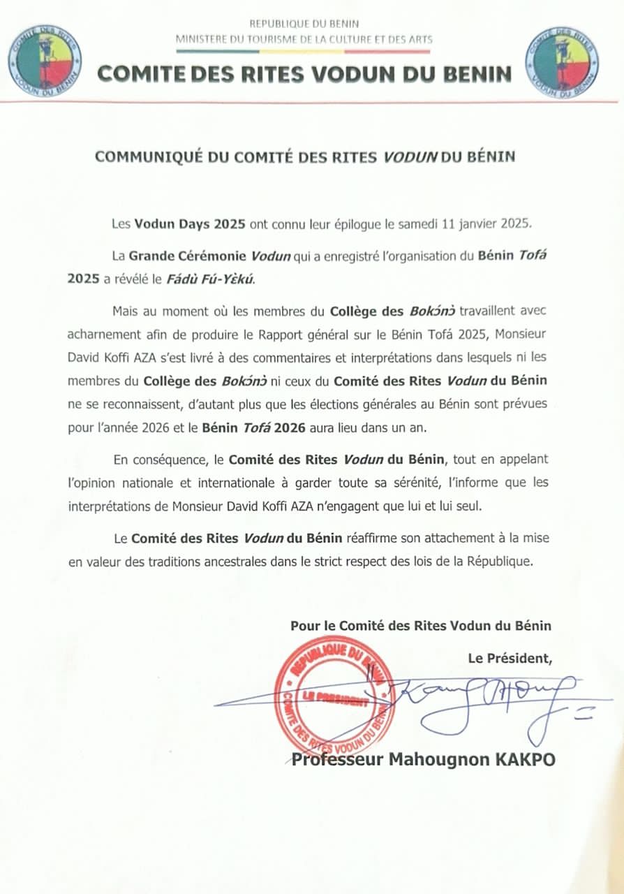 Le Comité des Rites Vodun du Bénin a publié un communiqué pour clarifier une situation qui fait grand bruit depuis les Vodun Days 2025, clôturés le 11 janvier dernier. Lors de la grande cérémonie marquant cet événement, le Fádu Fú-Yèkú a été révélé, mais voilà que les déclarations de David Koffi AZA, avec ses interprétations jugées personnelles, ont semé la confusion. Ni le Collège des Bokonɔ ni le Comité des Rites Vodun ne se reconnaissent dans ses propos, ce qui a poussé ces derniers à réagir fermement. Ils rappellent que les interprétations de M. AZA n’engagent que lui, surtout en cette période sensible où les élections générales de 2026 se profilent. Avec un appel au calme adressé à tous, le Comité a réaffirmé son engagement envers les traditions ancestrales tout en respectant les lois de la République.
