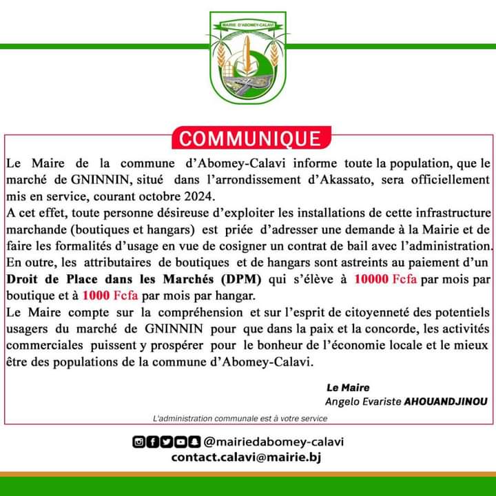 « Toute personne désireuse d’exploiter les installations de cette infrastructure marchande (boutiques et hangars) est priée d’adresser une demande à la mairie et d’accomplir les formalités nécessaires en vue de cosigner un contrat de bail avec l’administration », mentionne le document signé par le maire de la commune d’Abomey-Calavi. Selon le même communiqué, les attributaires de boutiques et de hangars devront s’acquitter d’un Droit de Place dans les Marchés (DPM) fixé à 10 000 FCFA par mois pour une boutique et à 1 000 FCFA par mois pour un hangar.