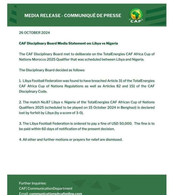 La Confédération Africaine de Football (CAF) a rendu son verdict concernant le litige opposant la Libye au Nigeria dans le cadre de la quatrième journée des éliminatoires de la CAN 2025 au Maroc.
