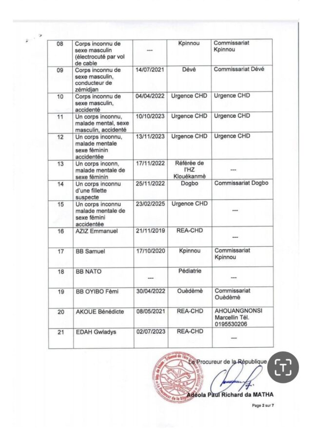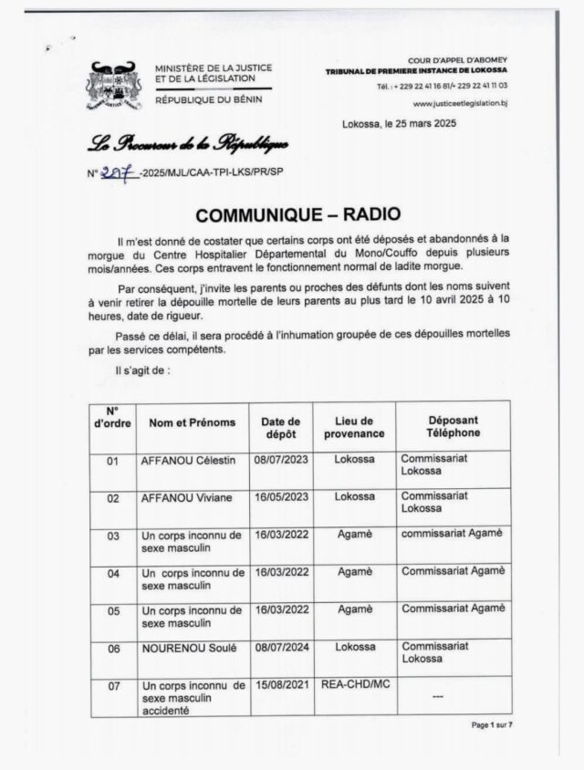 Dans un communiqué officiel daté du 25 mars 2025, le procureur de la République du tribunal de Lokossa a fait un constat à la morgue du Centre Hospitalier Départemental du Mono/Couffo. Plusieurs corps y ont été abandonnés, depuis des mois, voire des années, et cela perturbe le fonctionnement normal de la morgue. Face à cette situation, il a pris des mesures convenables. Il invite les proches des défunts dont les noms figurent sur une liste officielle à venir récupérer les dépouilles mortelles avant le 10 avril 2025 à 10 heures, délai de rigueur. Il prévient que si ces corps ne sont pas retirés à temps, une inhumation collective sera organisée par les services compétents. Lire le communiqué ci-dessous.