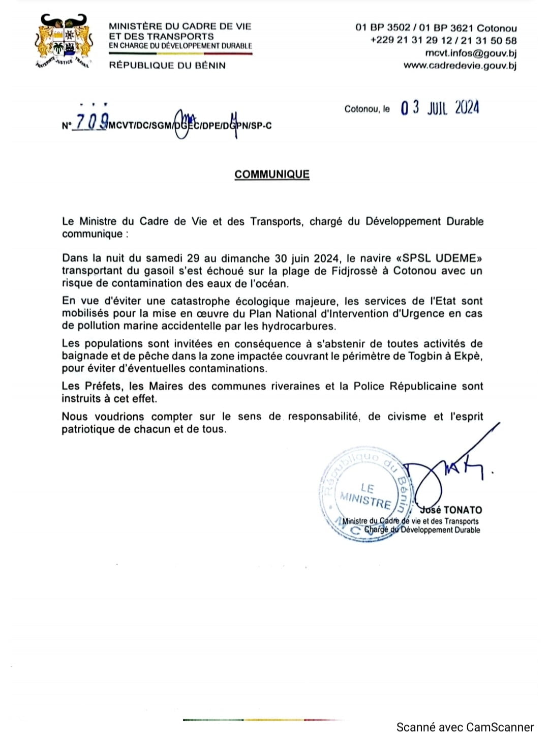 Lire le communiqué signé du Ministre de Cadre de Vie et du Développement Durable.