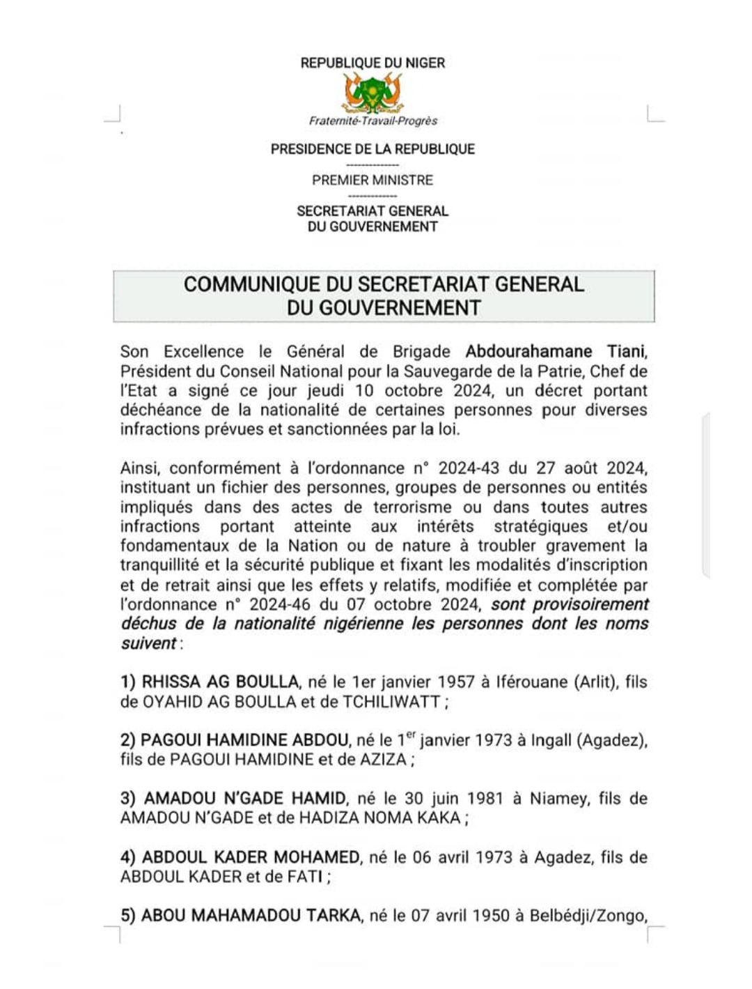 En effet, par un décret signé le 10 octobre 2024, le Général de brigade Abdourahamane Tiani a provisoirement retiré la nationalité à 09 personnalités considérant comme étant dans le cercle restreint de l’ancien président de la République. Dans le lot des 09 personnes, il y en a qui refusent de reconnaître l’autorité des militaires au pouvoir.