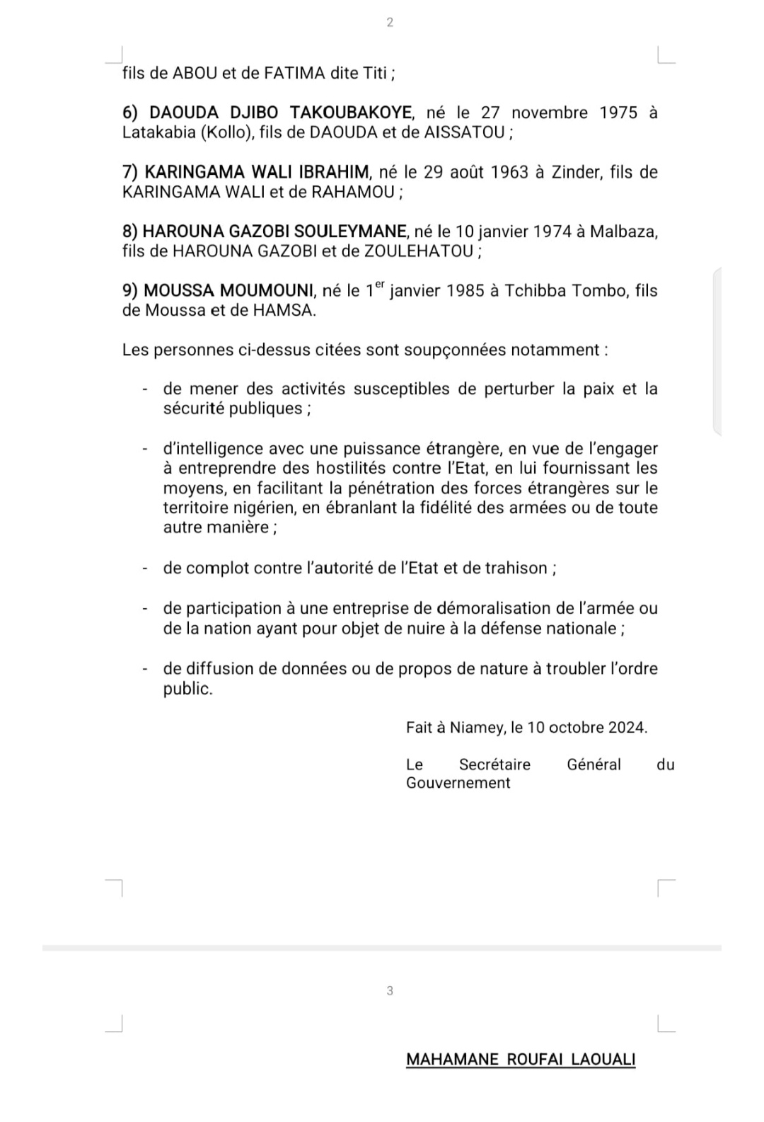Ces personnalités sont aussi soupçonnées de mener des “activités susceptibles de perturber la paix et la sécurité publique et de comploter contre l’autorité de l’Etat“. Lire le décret ci-dessous.