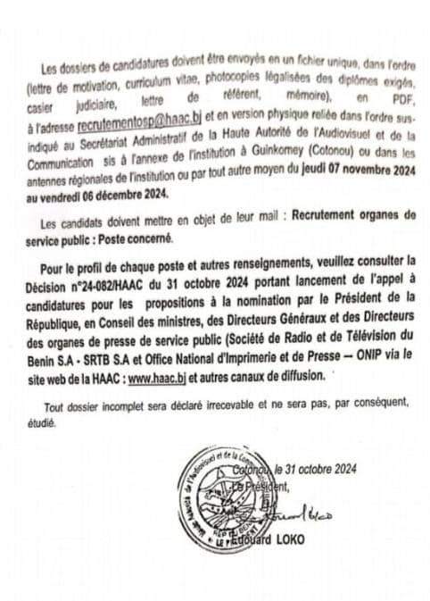 L’appel à candidatures a été annoncé par le président de la Haac, Edouard Loko, dans un communiqué officiel. Les candidats sélectionnés seront responsables de la direction de plusieurs entités clés du secteur de la presse publique, notamment la Société de Radio et de Télévision du Bénin (SRTB) et l’Office National d’Imprimerie et de Presse (ONIP), de Bénin TV, de Bénin TV Alafia, de Bénin TV Juniors, de la Radio Bénin, de la Radio Bénin Alafia, de KIFF FM, de la Radio Parakou, du journal La Nation. Les candidats doivent soumettre un dossier complet comprenant un mémoire de 3 à 5 pages décrivant leur vision du poste, une lettre de motivation justifiant leur adéquation au poste, un curriculum vitæ de deux pages au plus, les photocopies légalisées des diplômes exigés, un casier judiciaire datant de moins de trois mois et une lettre d’un référent avec contact ayant un lien avec les expériences professionnelles. Les dossiers incomplets seront automatiquement rejetés.