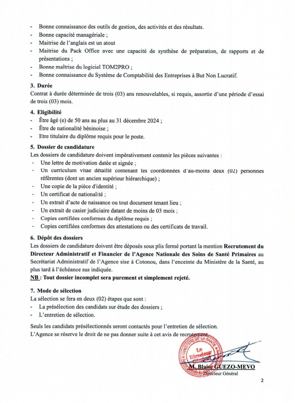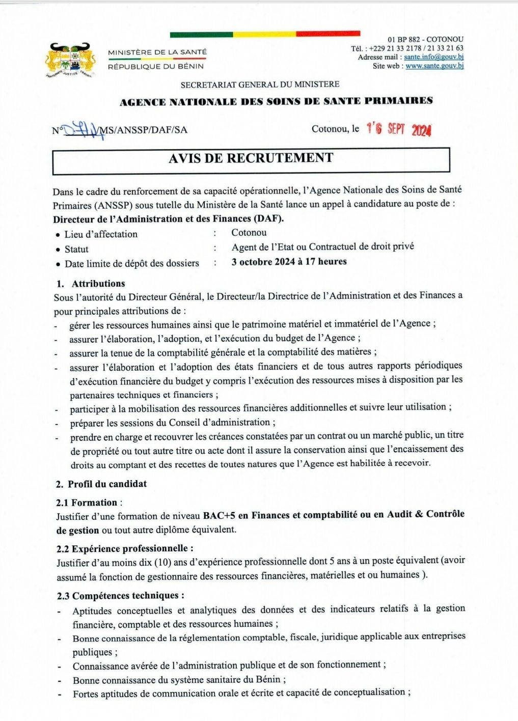 L’Agence Nationale des Soins de Santé Primaires ( ANSSP) a lancé un appel à candidature au poste de Directeur de l’Administration et des Finances ( DAF ).