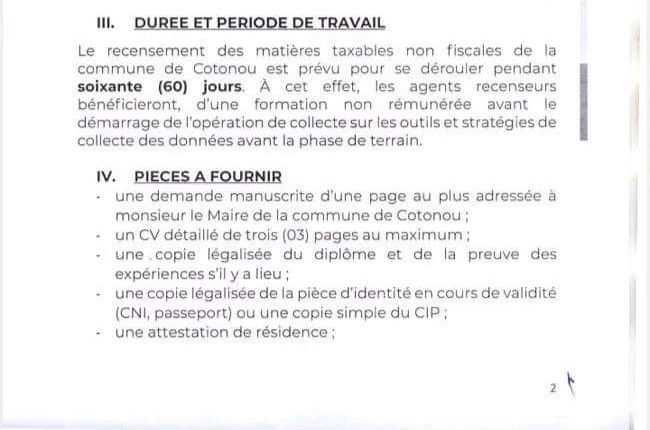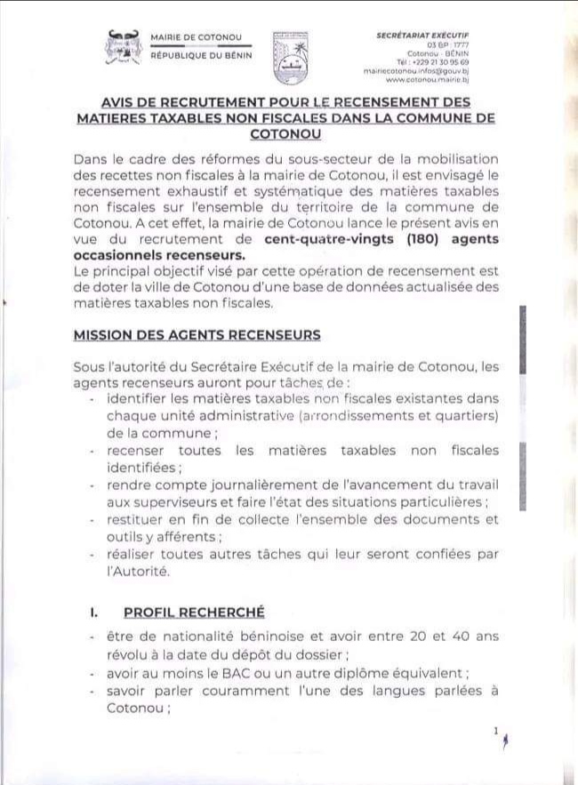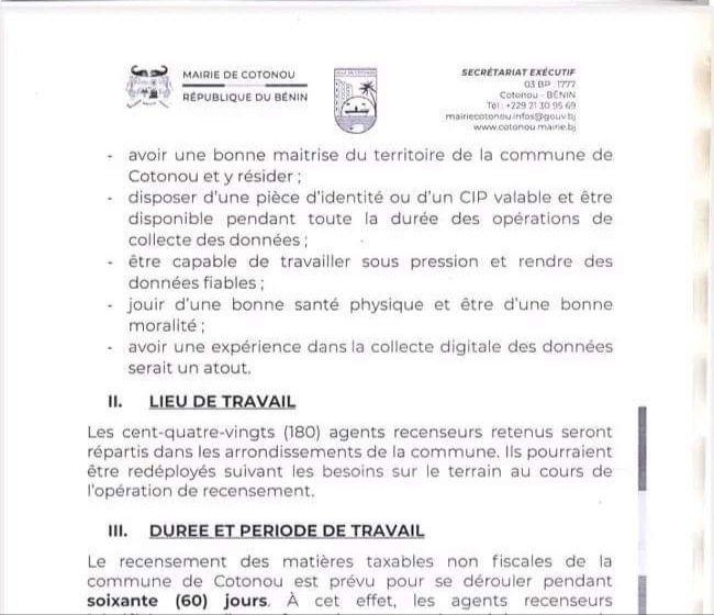 La Mairie de Cotonou a lancé le recrutement de 180 agents occasionnels recenseurs dans le cadre du recensement des matières taxable.