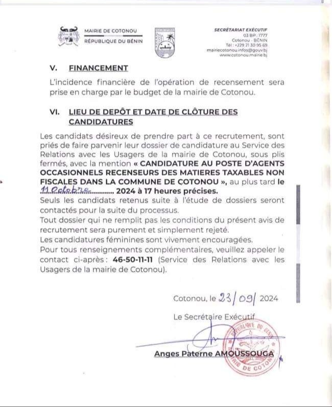 Les 180 agents, une fois recrutés, seront répartis dans les arrondissements de Cotonou pour l’opération. Lire le communiqué signé du Secrétaire Exécutif le 23 septembre 2024.