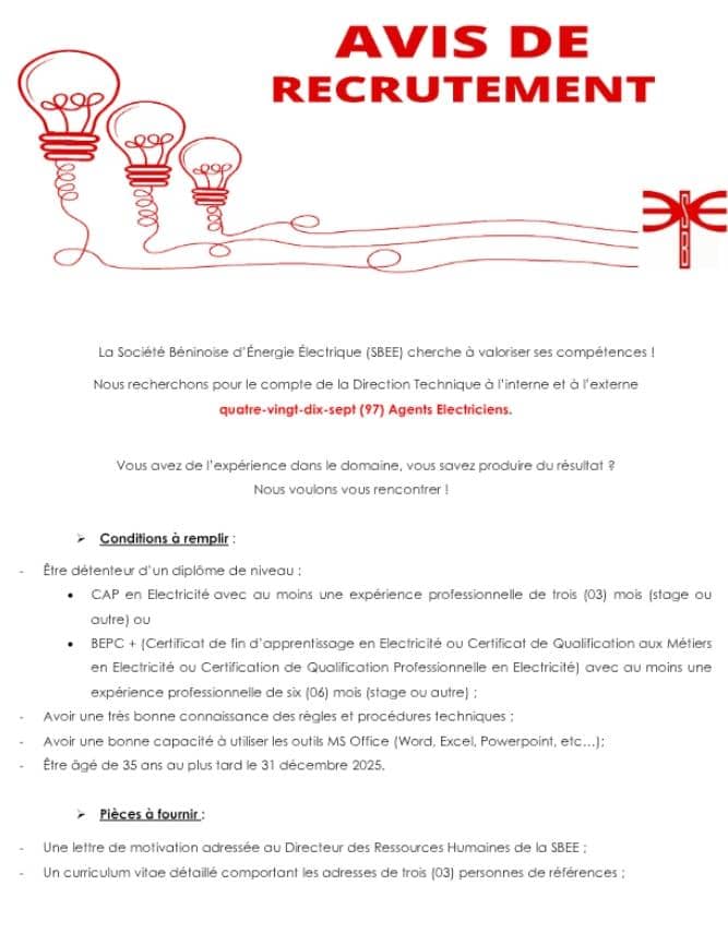 Bonne nouvelle pour les chercheurs d’emploi ! La Société Béninoise d’Énergie Électrique (SBEE) lance un grand recrutement. 113 postes à pourvoir. Il s’agit de 97 agents électriciens, 12 agents chargés de la détection des fraudes et anomalies, ainsi que 4 spécialistes en administration des systèmes et bases de données. Les candidats intéressés doivent soumettre leur dossier via la plateforme officielle https://recrutement.sbee.bj/. Pas de dépôt physique, tout se fait en ligne. La date limite est fixée au mercredi 5 mars 2025 à 17h30 précises. Passé ce délai, plus aucune candidature ne sera acceptée.