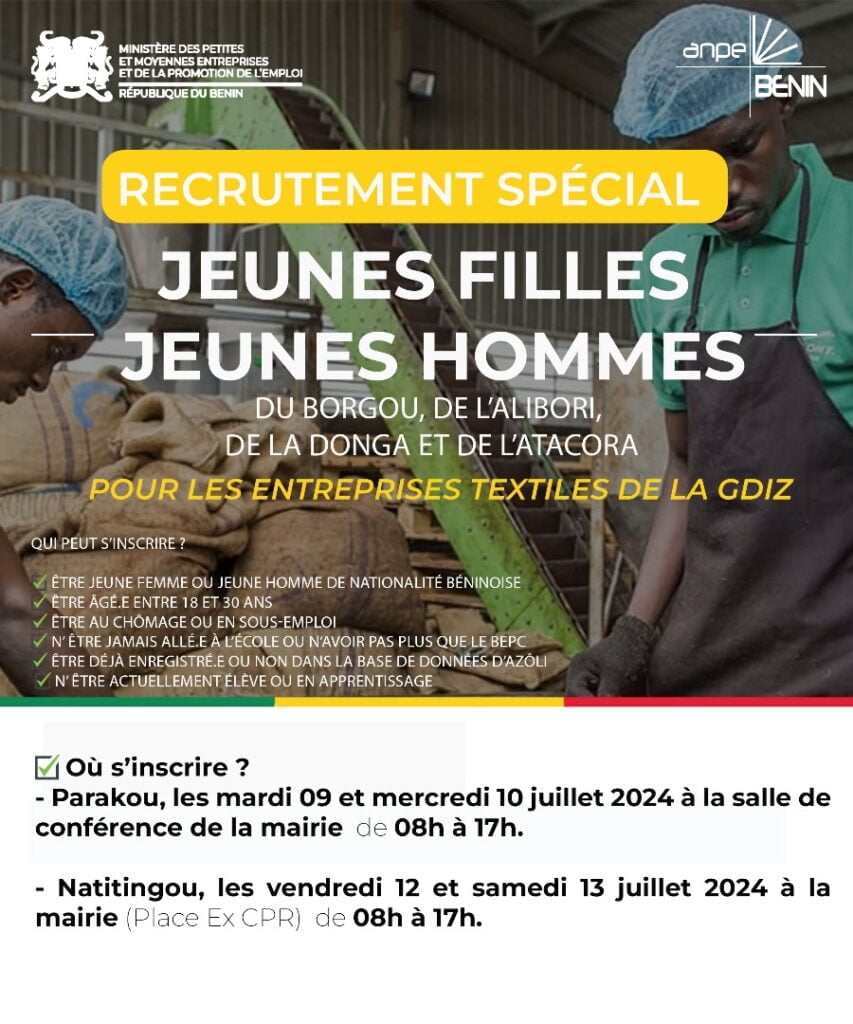 Il est lancé un recrutement spécial des jeunes filles et jeunes hommes des départements du Borgou, de l’Alibori, de l’Atacora pour les entreprises textiles de la GDIZ.