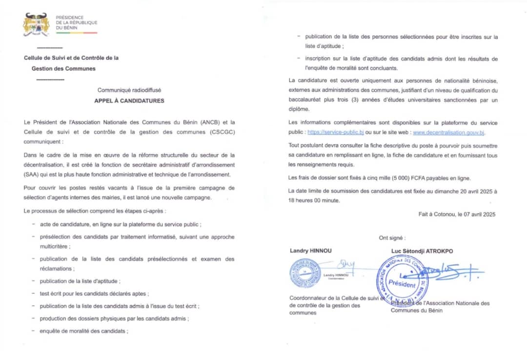 Dans un communiqué en date du 7 avril 2025, l’Association nationale des Communes du Bénin (ANCB) et la Cellule de suivi et de contrôle de la gestion des Communes (CSCGC) lance un appel à candidature pour la sélection d’une nouvelle vague de secrétaires administratifs d’arrondissement. Cet appel à candidature s’inscrit dans le cadre de la mise en œuvre de la réforme structurelle du secteur de la décentralisation et vise essentiellement à couvrir les postes restés vacants à l’issue de la première campagne de sélection d’argents internes des mairies.