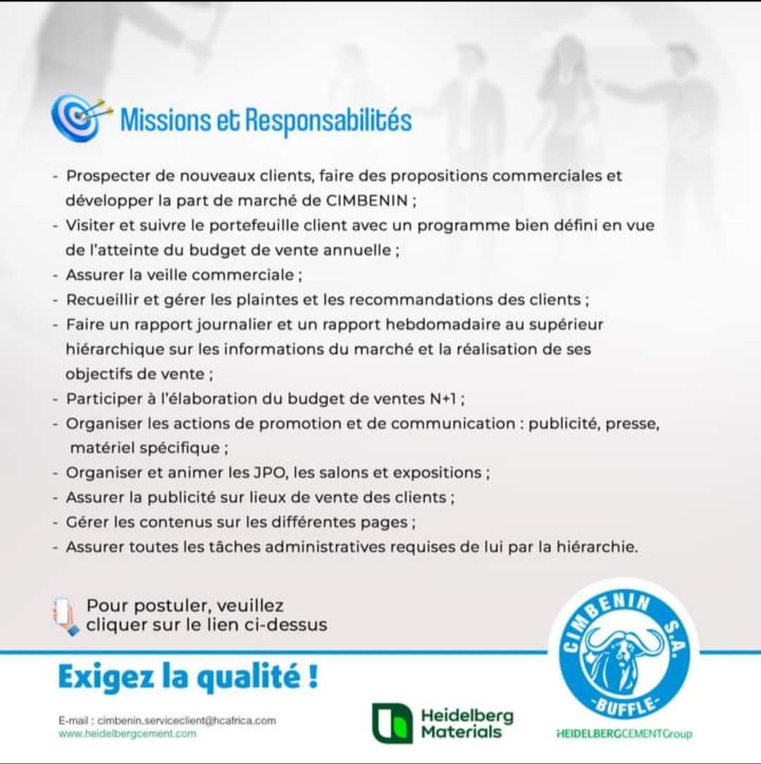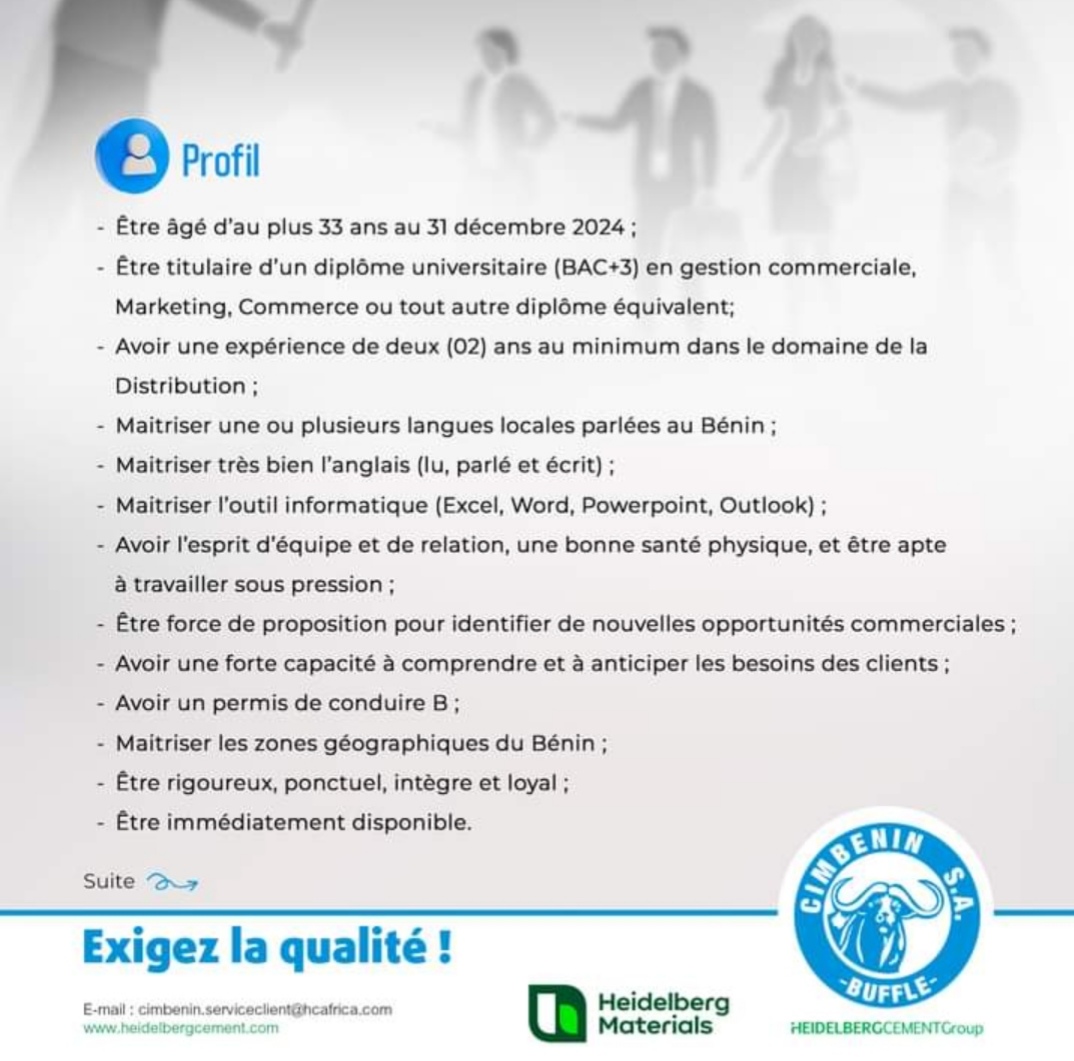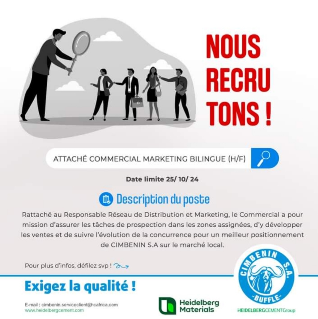 La Société CIM Bénin S.A recherche un(e) attaché(e) commercial (e) marketing. L’offre est valable jusqu’au 25 octobre 2024.