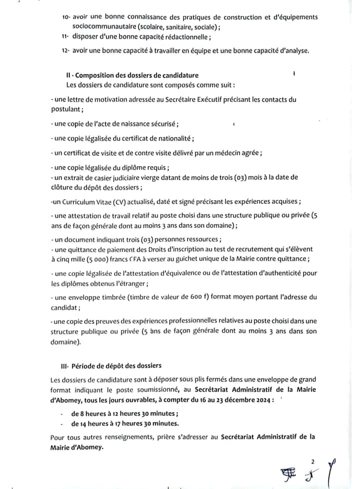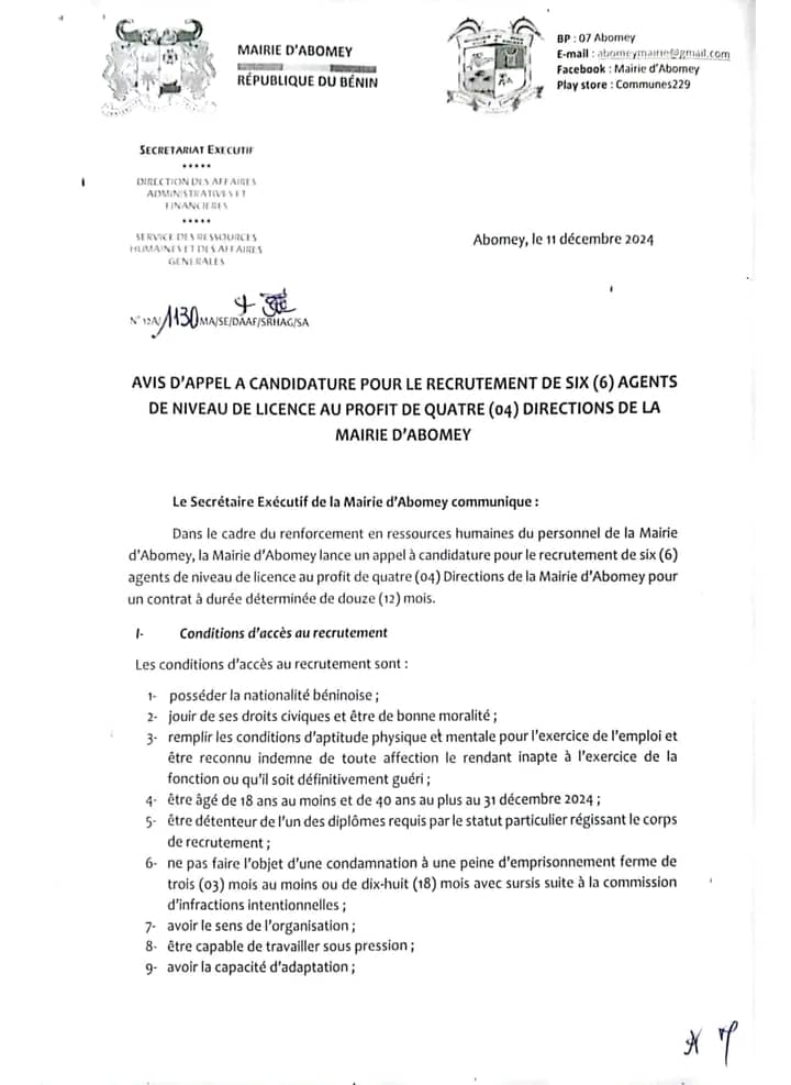 La Mairie d’Abomey a lancé un appel à candidatures pour le recrutement de six (06) agents titulaires d’un diplôme de niveau licence.