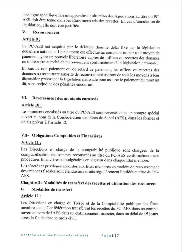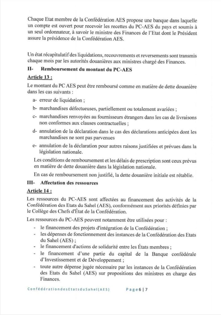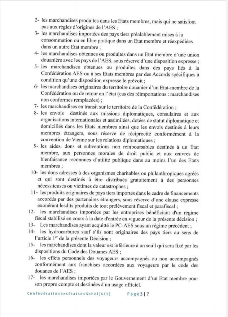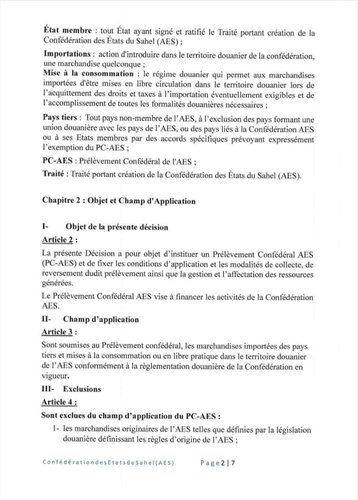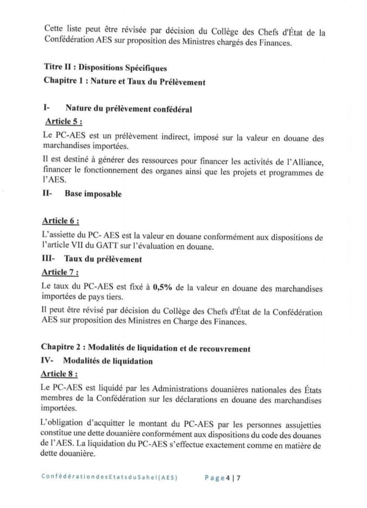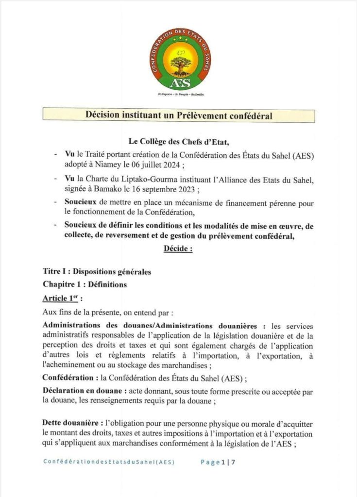 Dans une décision signée le 28 mars 2025, le Collège des chefs d’État du Niger, du Mali et du Burkina Faso a institué un Prélèvement confédéral (Pc-Aes). Le Pc-Aes est une taxe de 0,5% qui sera dorénavant prélevée sur la valeur en douane des marchandises importées de pays tiers par la Confédération des États du Sahel (Aes). L’objectif de cette décision est de générer des ressources pérennes pour financer les projets d’intégration, le fonctionnement des institutions et les actions de solidarité entre les États membres. La décision ne fait pas trop d’exigences aux importateurs mais allège plutôt les modalités d’importation dans ces pays du Sahel.