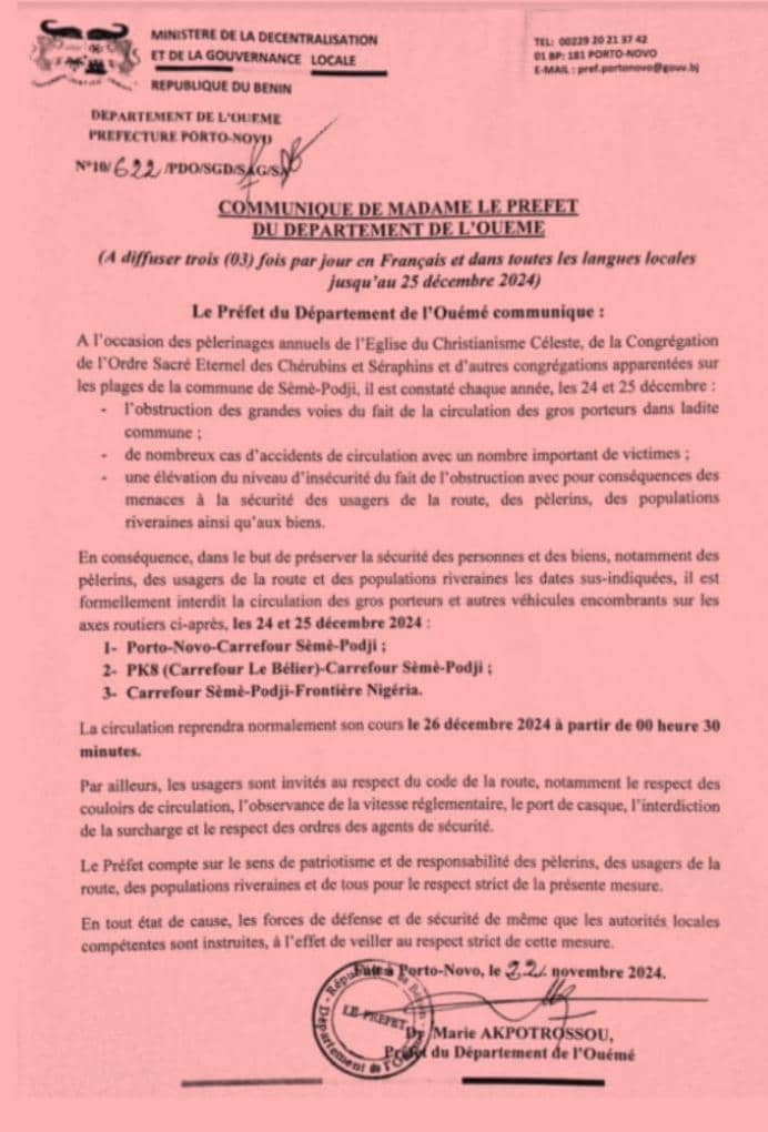 Le Pèlerinage annuel des fidèles de l’Église du Christianisme Céleste, un rendez-vous spirituel incontournable, se tiendra les 24 et 25 décembre 2024 dans la commune de Sèmè-Kpodji. En prélude à cet événement qui attire des milliers de pèlerins chaque année, le préfet du département de l’Ouémé a annoncé, dans un communiqué rendu public le 22 novembre 2024, la mise en place de mesures sécuritaires destinées à garantir la fluidité de la circulation et à prévenir les accidents.