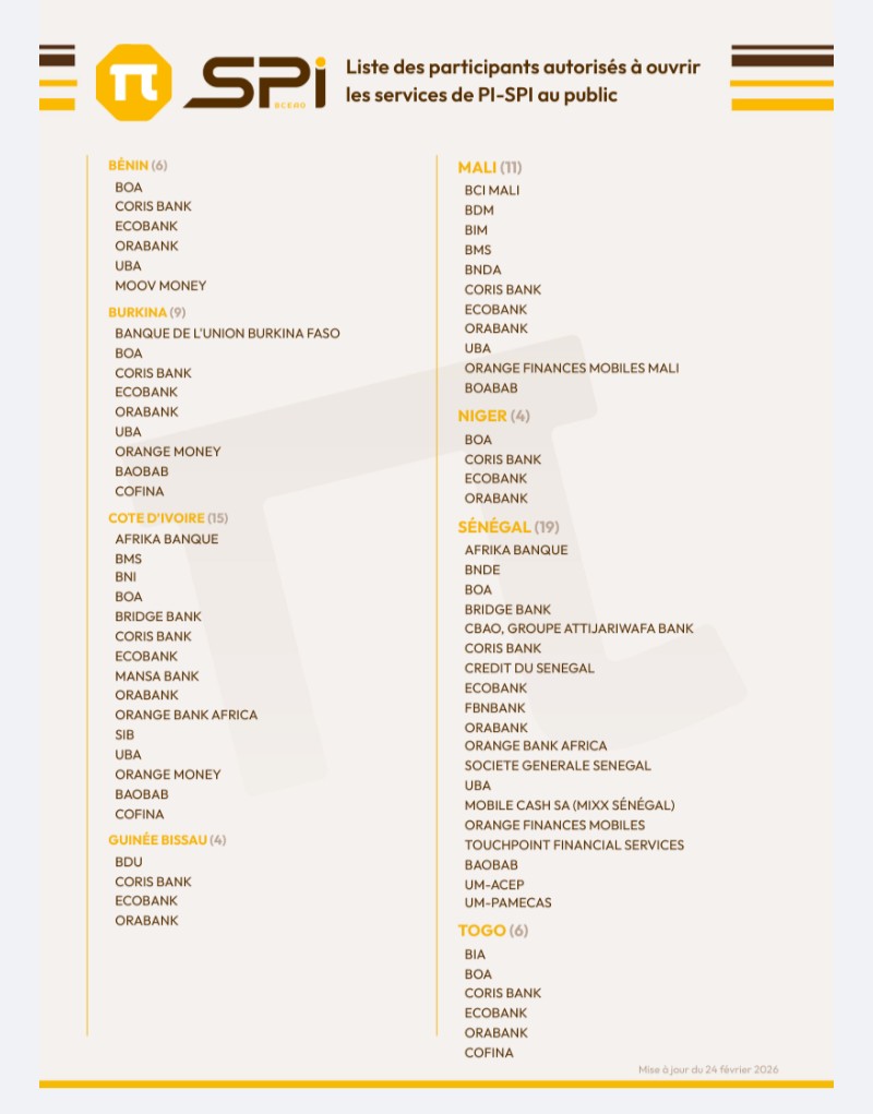Le PI-SPI est déjà opérationnel dans les pays de l’UEMOA. Au Bénin, les participants à ce système sont revus à six. Il s’agit de BOA, Coris Bank, EcoBank, Orabank, UBA et Moov Money. Consultez la liste complète des participants de PI-SPI dans l’espace UEMOA.