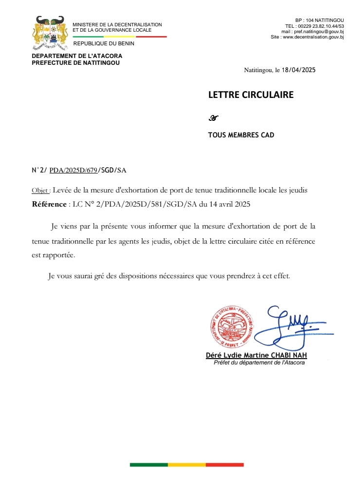 Une note circulaire du 14 avril 2025 exhortait les fonctionnaires des services publics du département de l’Atacora à porter une tenue traditionnelle chaque jeudi. L’objectif affiché par la préfète Lydie Chabi Nah Déré était de: «Valoriser le savoir-faire de nos artisans et promouvoir notre riche patrimoine culturel». Mais à peine une semaine après son instauration, une nouvelle note circulaire met fin à cette exhortation. Les motifs de cette nouvelle décision n’ont pas été exposés.