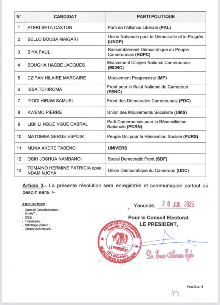 Le Conseil électoral du Cameroun, dénommé ELECAM, a validé ce samedi 26 juillet 2025 la liste définitive des candidats à l’élection présidentielle prévue le 12 octobre 2025. Treize personnalités politiques ont été retenues, dont le président Paul Biya, au pouvoir depuis 1982.