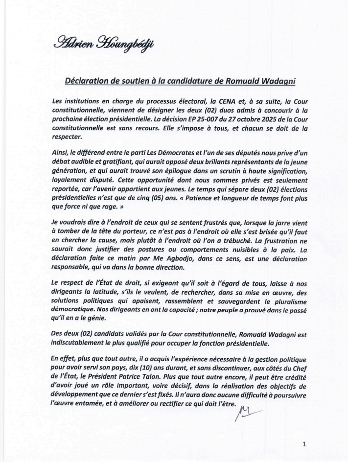 Par ailleurs, en portant son soutien à Romuald Wadagni, Adrien Houngbédji a essayé de justifier en quoi sa candidature force l’admiration. « Il [ Romuald Wadagni] a acquis l’expérience nécessaire à la gestion politique pour avoir servi son pays dix ans durant, aux côtés du Président Patrice Talon. Plus que tout autre encore, il peut être crédité d’avoir joué un rôle décisif dans la réalisation des objectifs de développement du Chef de l’État. », a-t-il confié. Avant de saluer la désignation du dauphin de Talon, il a formé le vœu que son candidat «résiste à la tentation de l’autoritarisme et qu’au contraire» et «consolide l’ancrage de notre pays dans la démocratie et l’État de droit». Cette déclaration de Maître Adrien Houngbédji prouve l’adhésion de grossesses cylindrées autour de la candidature de Romuald Wadagni. Très tôt, CA Paul Kéta a invité les Béninois à faire le rang derrière le duo de la mouvance présidentielle. On peut dire que Adrien Houngbédji a favorablement répondu à cet appel après une mûre réflexion. Lire sa déclaration ci-dessous.