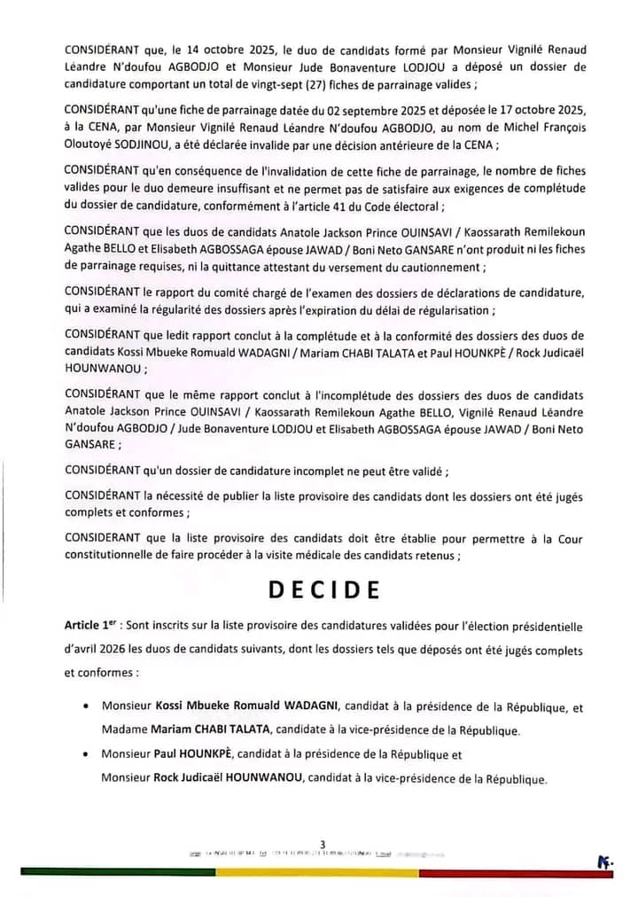 La Commission Électorale Nationale Autonome (CENA) a franchi une étape décisive dans le processus de la présidentielle de 2026. Par décision N°025/CENA/PT/RAP/DGE/SP en date de 2025, l’institution a rendu publique la liste provisoire des duos de candidats dont les dossiers de candidature ont été jugés complets et conformes. Après examen minutieux des pièces, seuls deux duos ont obtenu le feu vert de la CENA pour figurer sur cette liste provisoire. Il s’agit de Kossi Mbuëke Romuald Wadagni, candidat à la présidence, et Mariam Chabi Talata, candidate à la vice-présidence ; ainsi que Paul Hounkpè, candidat à la présidence, et Rock Judicaël Hounwanou, candidat à la vice-présidence. Les autres duos ayant déposé leurs dossiers n’ont pas satisfait aux exigences légales, notamment en ce qui concerne les fiches de parrainage et les pièces de cautionnement. Parmi eux figurent les tandems Vignilé Renaud Léandre Agbodojo / Jude Bonaventure Lodjou, Anatole Jackson Prince Ouinsavi / Kaossarah Agathe Bello, ainsi qu’Élisabeth Agbossaga épouse Jawad / Boni Neto Gansaré. Leurs candidatures ont été jugées incomplètes et donc non retenues à ce stade du processus. Cette décision ouvre désormais la voie à la Cour constitutionnelle, qui procédera à la vérification finale des dossiers et à la visite médicale des candidats avant la publication de la liste définitive des duos autorisés à concourir à la magistrature suprême en 2026.