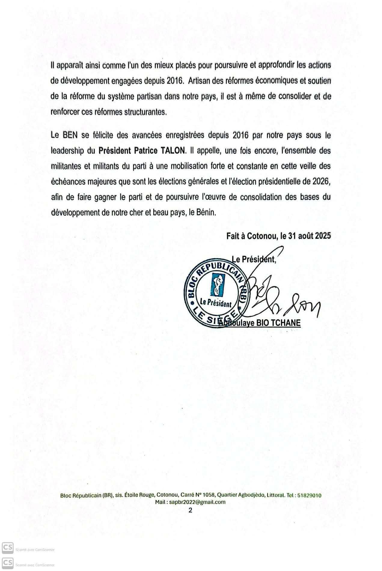 Les voix s’élèvent pour soutenir la candidature de Romuald Wadagni. Après le président du parti Up le Renouveau, Joseph Fifamè Djogbénou et de la presidente de la RN, Claudine Prudencio, qui ont approuvé cette candidature, le Bloc Républicain les officiellement suivis à travers une déclaration. Le parti du Ministre du Plan et du développement, Abdoulaye Bio Tchané a officialisé la candidature de l’argentier national.Lire le communiqué ci-dessous.