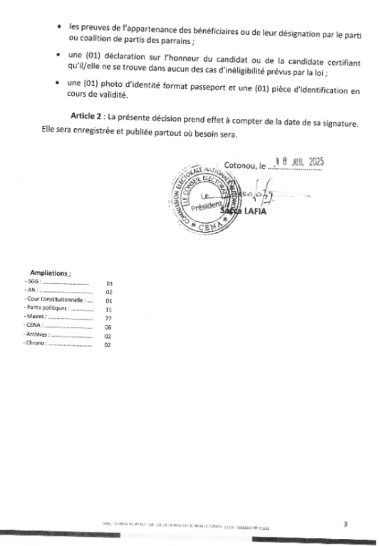 ‎En ce qui concerne les pièces individuelles, chaque membre du duo doit fournir un certificat de nationalité béninoise, un extrait d’acte de naissance ou une pièce équivalente, un bulletin n°3 du casier judiciaire datant de moins de trois mois, ainsi qu’un certificat de résidence. Le dossier doit également comporter le quitus fiscal couvrant les trois dernières années (2022, 2023 et 2024), une pièce d’identification en cours de validité, une photo d’identité au format passeport, et une déclaration sur l’honneur attestant que le candidat ne se trouve dans aucun cas d’inéligibilité prévu par la loi. Enfin, les candidats doivent joindre les preuves d’appartenance au parti ou coalition de partis des parrains, ou les documents qui justifient leur désignation par ces partis.