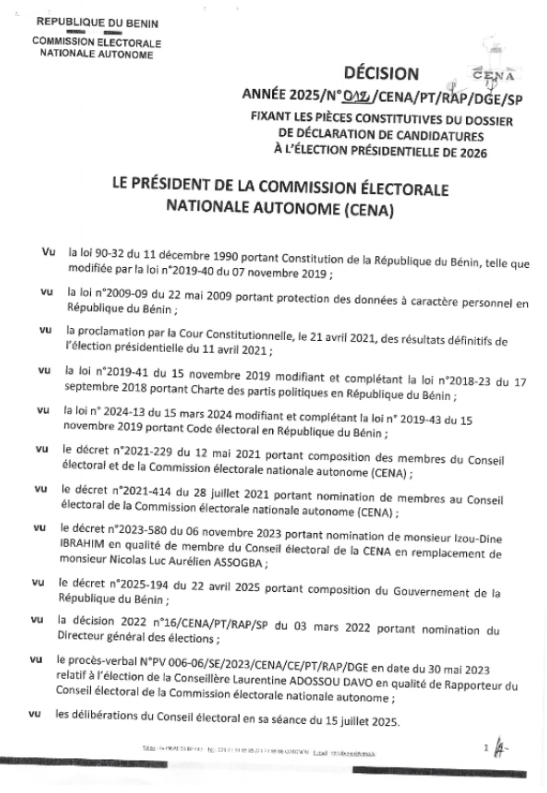 Par un décision en date du 18 juillet 2025, la Commission Électorale Nationale Autonome (CENA) du Bénin a publié la liste officielle des pièces constitutives du dossier de candidature à l’élection présidentielle prévue pour le 12 avril 2026. Cette décision, signée par le président de la CENA, Sacca Lafia, précise les documents requis pour chaque duo de candidats à la présidence et à la vice-présidence, en distinguant les pièces communes et les pièces individuelles.