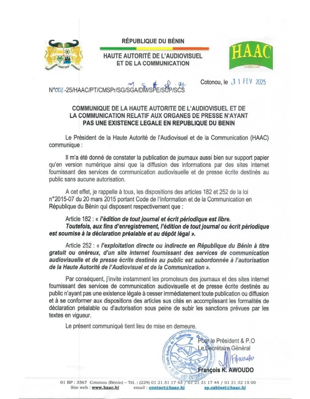 Par un communiqué en date du 1er février 2025, la Haute Autorité de l’Audiovisuel et de la Communication (HAAC) rappelle à l’ordre les journaux et sites internet qui publient sans autorisation en République du Bénin.