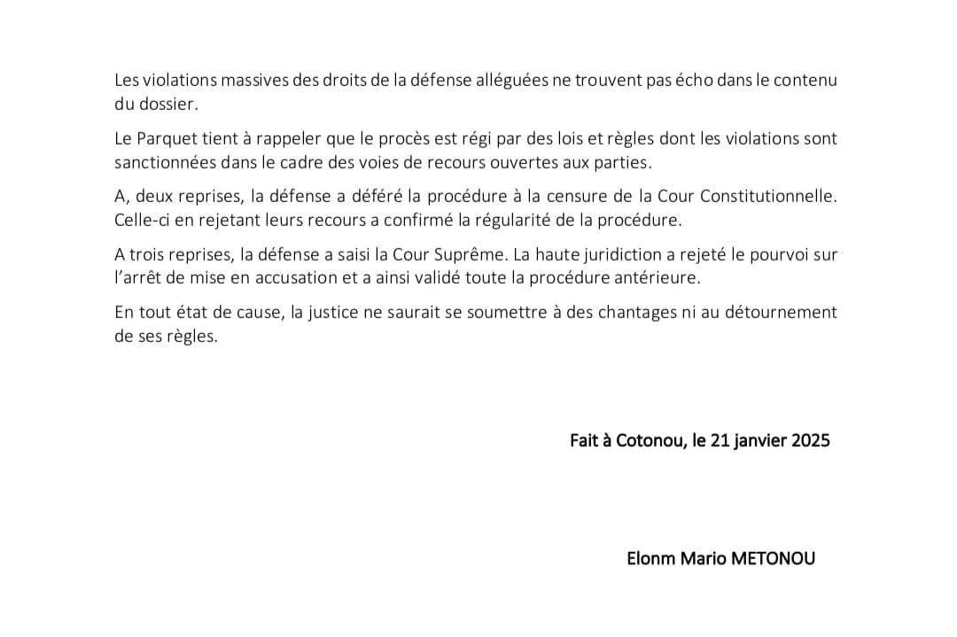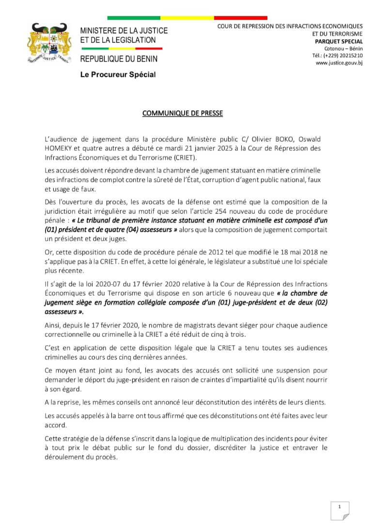 Dans un communiqué publié dans la soirée du 21 janvier 2025, le Procureur spécial de la CRIET, Elonm Mario Metonou, a répondu aux critiques de la défense sur la composition de la juridiction. Il a rappelé que la CRIET, régie par une loi spéciale de 2020, siège avec un président et deux assesseurs, et non selon les dispositions générales du code de procédure pénale. Cette règle est appliquée depuis cinq ans, sans contestation antérieure.