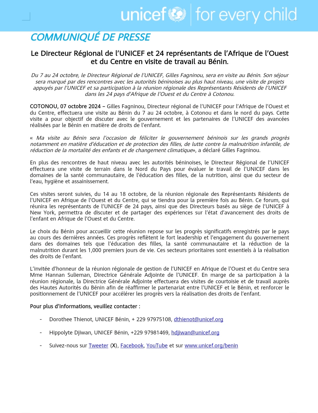L’occasion sera également pour le Directeur régional, d’évaluer les efforts de l’Unicef dans les domaines de la santé communautaire, de l’éducation des filles, de la nutrition, ainsi que du secteur de l’eau, hygiène et assainissement au Bénin. L’autre activité phare de la visité est la réunion régionale des Représentants Résidents de l’UNICEF en Afrique de l’Ouest et du Centre, qui se tiendra pour la première fois au Bénin du 14 au 18 Octobre 2024.