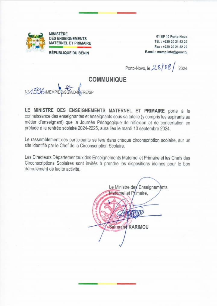 Le ministre des enseignements maternel et Primaire Salimane Karimou invite les enseignants à répondre présents à la journée de réflexion et de concertation en prélude à la rentrée scolaire 2024- 2025.