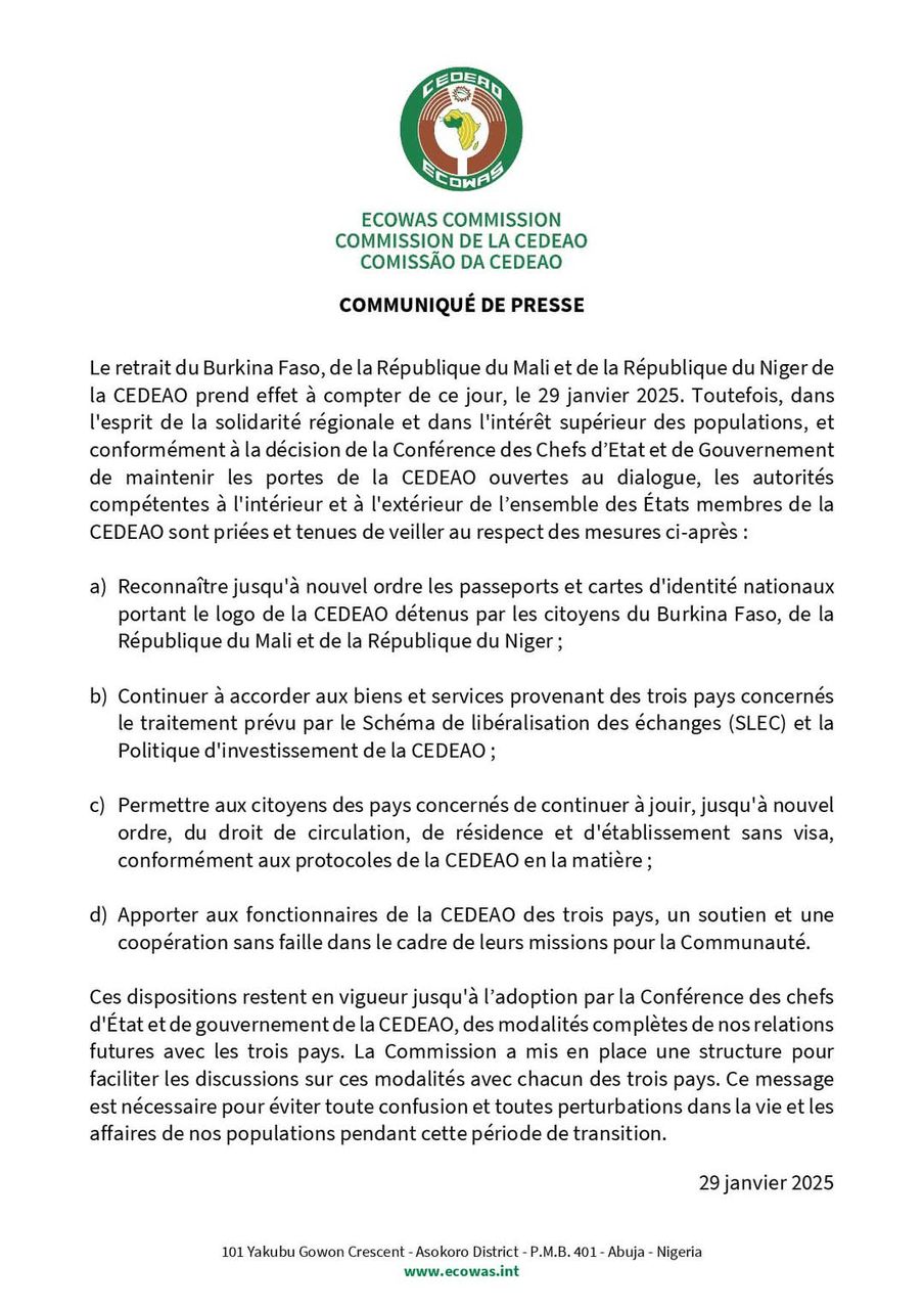 Par ailleurs, la CEDEAO assure que les citoyens du Mali, Niger et Burkina Faso conservent leur droit de circulation, de résidence et d’établissement sans visa dans les États membres. Les fonctionnaires de la CEDEAO issus de ces pays continueront de recevoir le soutien de l’organisation. Un cadre de discussion est mis en place pour définir les futures relations avec ces ex-membres, désormais réunis au sein de l’Alliance des États du Sahel (AES).