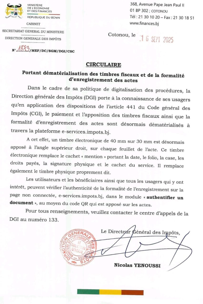Dans une note circulaire publiée le 16 septembre 2025, la Direction Générale des Impôts (DGI) du Bénin a annoncé une réforme importante dans la gestion des formalités fiscales. Désormais, les timbres fiscaux et l’enregistrement des actes ne se feront plus physiquement, mais exclusivement par voie électronique. Cette décision s’inscrit dans une volonté de modernisation des services publics et d’amélioration de l’efficacité administrative.