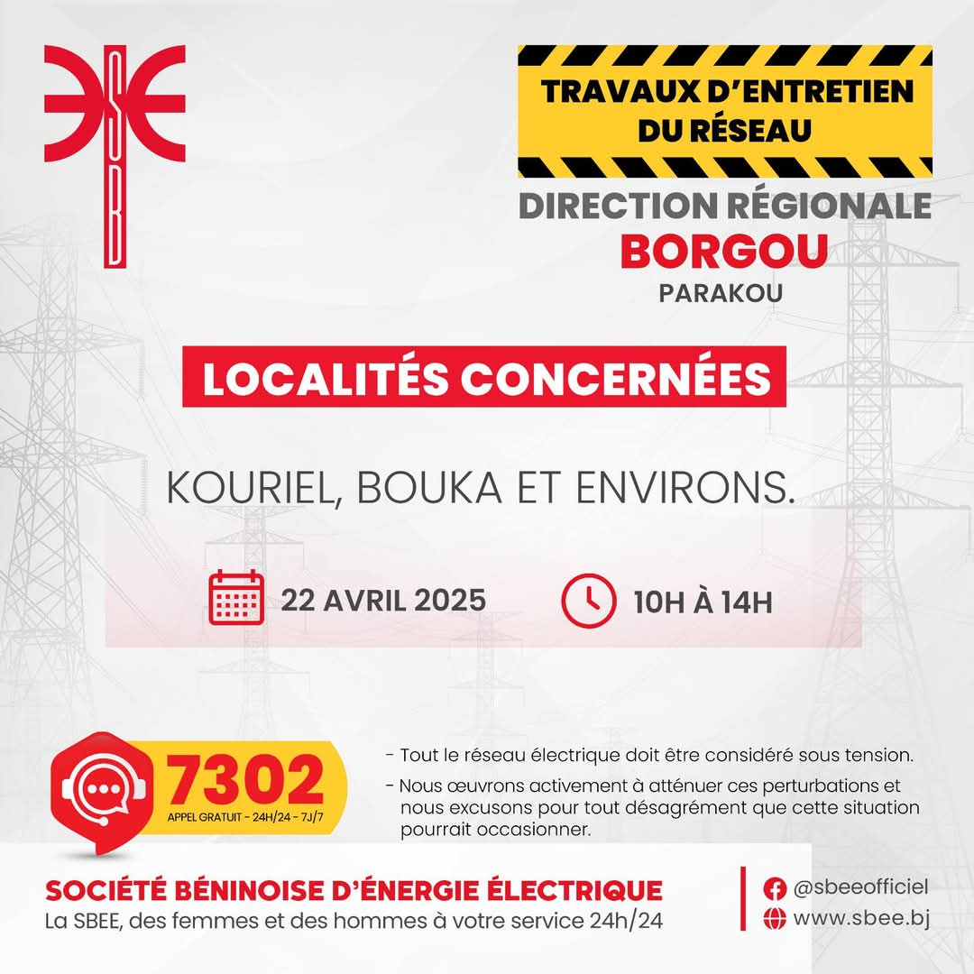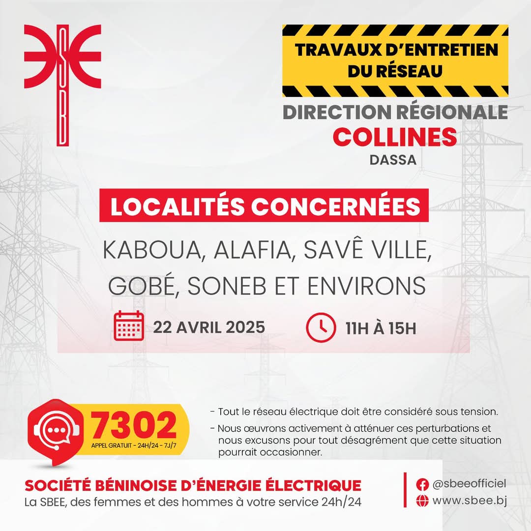 Dans le cadre de ses efforts pour améliorer la qualité de la desserte en électricité, la Société Béninoise d’Énergie Électrique (SBEE) annonce la réalisation de travaux de maintenance sur le réseau électrique ce mardi 22 avril 2025. Les opérations visent à renforcer la fiabilité et la performance du système de distribution. Elles pourraient entraîner des perturbations temporaires dans la fourniture d’électricité dans certaines localités concernées.
